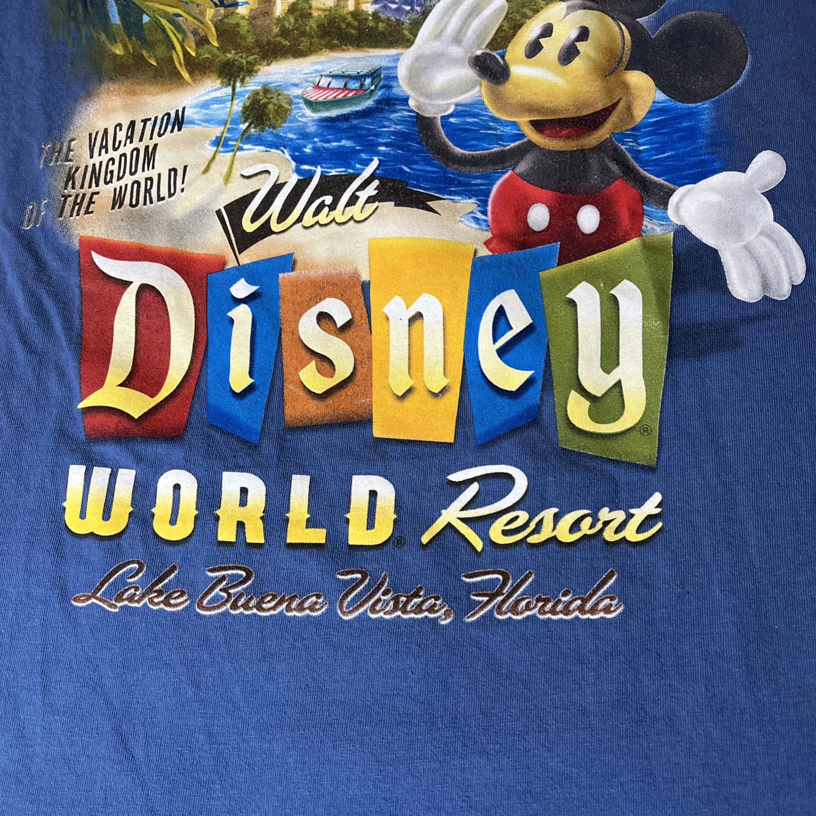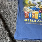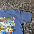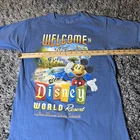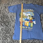 This blue T-shirt features a graphic print of Mickey Mouse and the text "Welcome To World Famous Walt Disney World Resort." Made of cotton knit fabric, it has a crew neck and short sleeves, making it suitable for all seasons. The shirt is machine washable and preshrunk, with a regular fit in size medium, perfect for unisex adults who are fans of Disney and cartoons. The logo accent adds a touch of authenticity, making it a must-have for Disney vacation enthusiasts.
