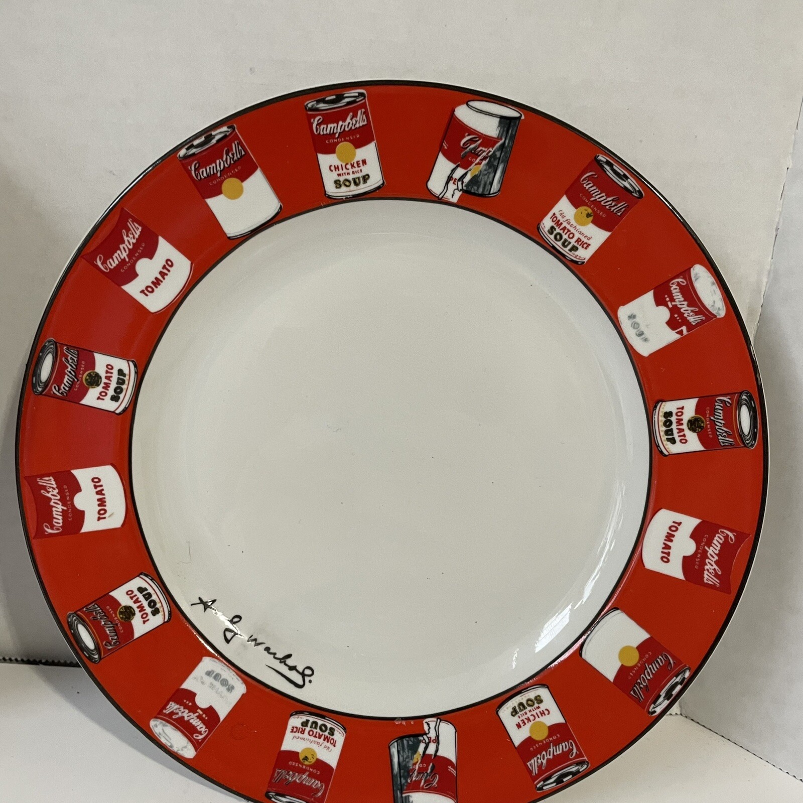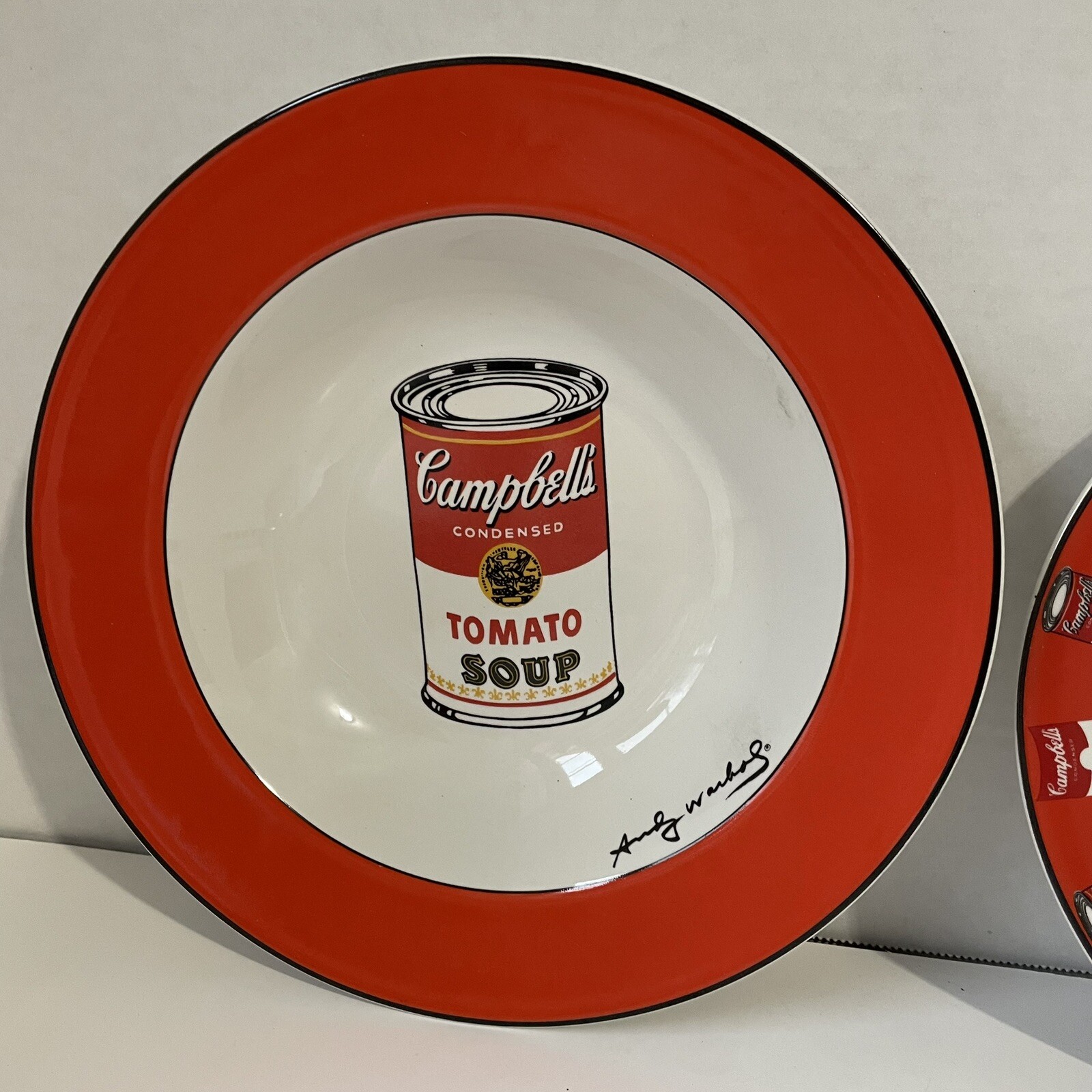 The Campbell's Tomato Soup Can Ceramic Soup Bowl & Salad Plate is a rare vintage set by Block Art featuring Andy Warhol's iconic design. Made of Bone China, the round bowl and salad plate are adorned with the classic Campbell's soup can pattern in white. The set includes a soup bowl and salad plate, both microwave and dishwasher safe, making them suitable for all occasions. With a printed backstamp indicating its originality, this unique collectible set is a must-have for fans of Andy Warhol's art and vintage pottery enthusiasts.