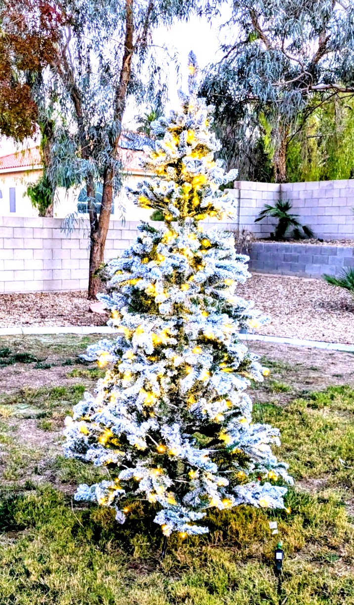 Excellent Used Condition-Fully functional, no broken pieces, and no missing pieces. Glitzhome quality construction and design. Measures 7.5ft tall and approximately 5ft wide in diameter. Pre-Lit 400 Warm White LED Lights. Full size holiday snow flocked fir Christmas Tree. Includes stand, 3 piece separating easy-to-store tree with interconnecting plug for connecting each tree segment to enable the white LED lights. Simply take the stand out and slide it to the x-form support, then slide the 3tree segments into each other to form the 7.5ft tree, plug each tree part into the included electric extension cord, connect the plug and plug into a standard US socket and the tree is ready for display and further decoration-set up is less than 5mins. 16G