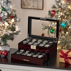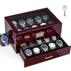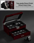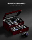 20 SLOT WATCH DISPLAY CASE: Watch box size: 11.9 "L x 8" W x 6 "H (30.2 x 20.3 x 15.3cm), watch pillow size: 2.8" L x 2 "W (7.2 x 5 cm).This men's watch case is made of wood has 20 watch slots on the upper layer, Jewelry compartments on the lower layer, and a large glass lid.It holds your watches collection very well and keeps your jewelry(chunky rings and bracelets and tie pins)organized. WATCH CASE with GLASS LID and LOCK : You can stow away your watches and admire them at the same time through the transparent glass.And it can be placed in a well lit area without hindering the charging of your solar watch.The lockable feature offers peace of mind, ensuring that your watches are safely protected from unauthorized access ATTRACTIVE WATCH BOXES:The watch box's sleek and sophisticated design adds a touch of luxury to your watch collection, The wood grain and piano lacquer craftsmanship and super quality soft PU lining make it look luxurious and charming.The beautiful hardware buckle makes it more exquisite WATCH BOX for MEN:You can also use it as a jewelry box to store your chunky rings, Bracelets, and tie pins. Organize all of your watches/jewelry in one place and protect them against dampness, shaking and friction, or missing. Make it so easy to select the watch/jewelry you will be wearing STYLISH GIFT for MEN: This fancy watch holder is a stylish gift for men.No one can refuse such a beautiful and practical gift.It can be a gift to your husband, father, boyfriend, or friend on New Year, Christmas, birthday, anniversary, wedding, Valentine's Day, Thanksgiving, and so on