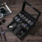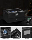TOP-NOTCH QUALITY & CLASSY LOOK: Made from quality textured black carbon fiber cover, well-done seams, refined interior, smooth actual hinge, see-through real glass top, this well-built watch box is sturdy as well as elegant. The black color and sleek design can match the dresser perfectly. Your man must be very happy when receiving such a nice gift at birthday or Christmas WATCH & JEWELRY COMBO CASE: The first layer offers 12 sections to hold your watches, and the watch holders can be removed if you need upper tier space for other items. The bottom drawer provides additional storage for extra bands, rings, bracelets, tie clips, cuff links and other jewelry accessories. And the 3 main cases for the 2nd layer can be combined freely for showing the jewelry HIGH QUALITY PILLOWS & FIT FOR VARIOUS WATCH STYLES AND SIZE: Made of high quality PU and sponge cushions, indeformable & soft, protect your watches from dust, damp and shock perfectly. The flexible squares are large enough to fit men's giant wrists, but also pliable enough to accommodate women's daintier jewelry if need be. The size for each watch slot is 3.5"L x 1.7"W STURDY METAL HINGE & ONE HAND EASY OPEN BUCKLE: There is a sturdy metal hinge support instead cloth ribbon which helps to keep the top propped open. You can open and close it in seconds with one handed operation, very convenient and no time consuming CONVENIENT LARGE SEE-THROUGH GLASS WINDOW: Do you always tuck your watch collection away in a drawer or just let them sit around on desks everywhere? Have you felt frustrated to search all your place to find the watch you want to wear? This watch box, with real glass window, is able for you to see all the watches in the box and help you decide quickly which watch to wear. It will display all your watches in a convenient, fashionable and clear way