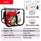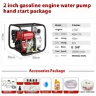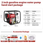 Name: Gasoline Engine Water Pump Pump Model: 2 inches Engine: 170F Power: 85HP Speed: 3600r/min Size: Length 50 * Width 35 * Height 45cm Caliber: 50mm (2 inches) Flow rate: 40m3/h Lift: 40m Suction distance: 8m Weight: 20kg Applicable: 92 octane or above gasoline