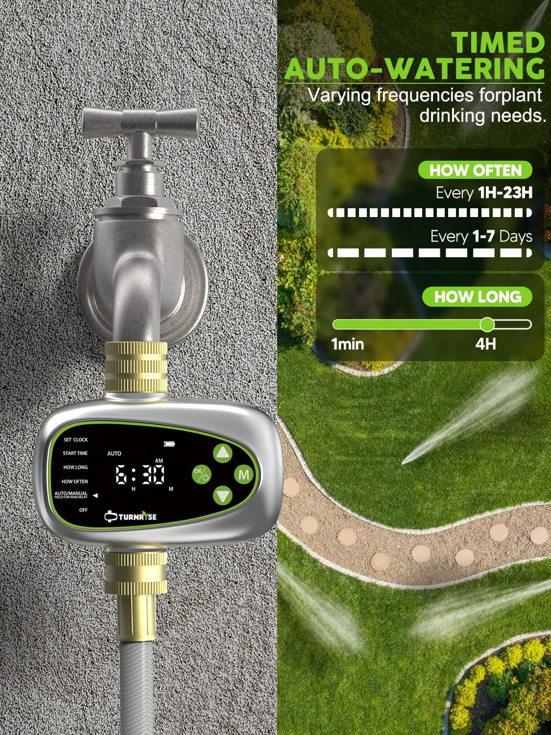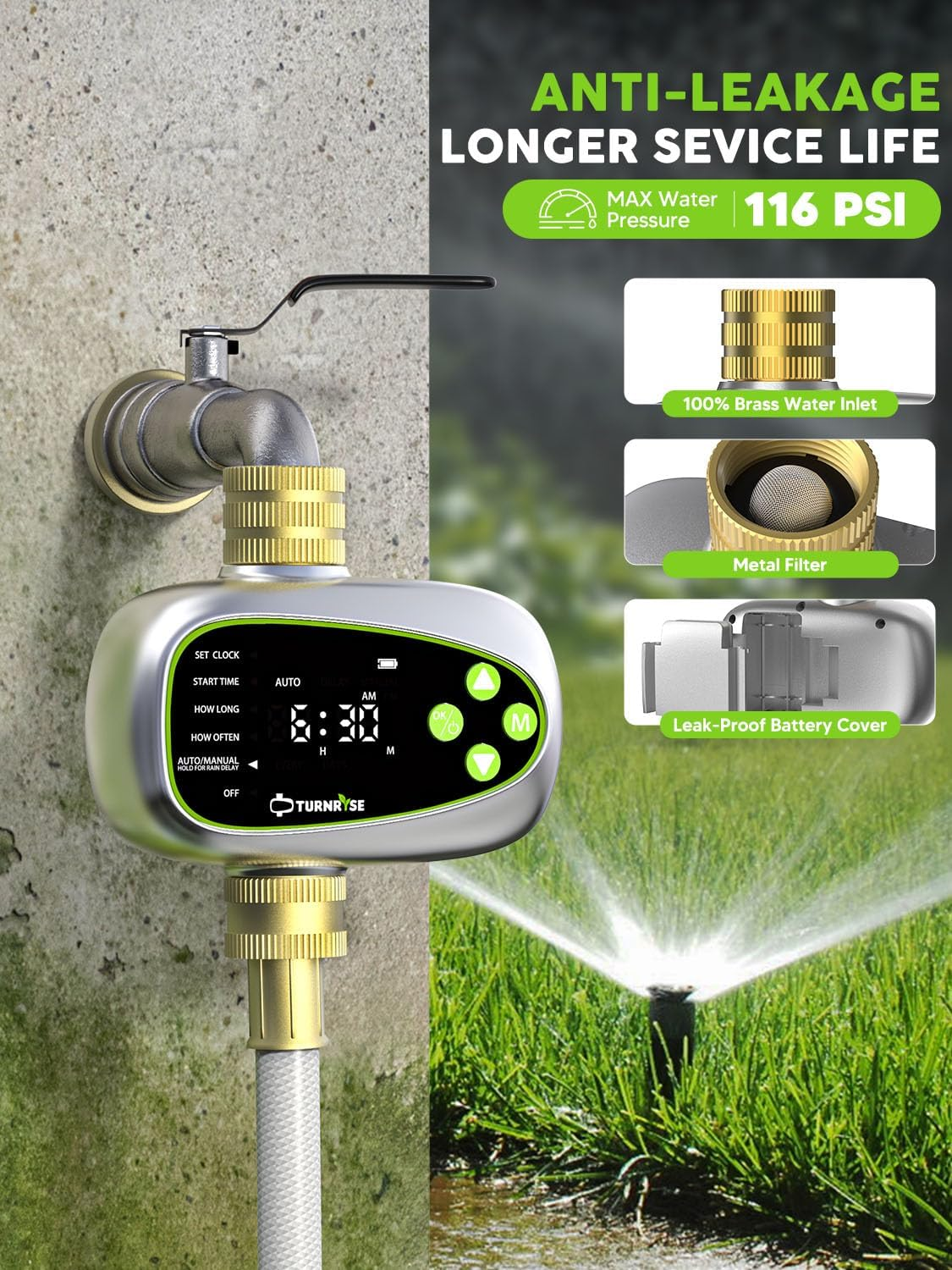 PROGRAMMABLE Water Timer: Easy-to-use digital interface allows you to set custom watering schedules for automatic garden irrigation. SINGLE ZONE CONTROL: Dedicated garden hose timer manages one watering zone with precision timing for optimal garden maintenance. UNIVERSAL COMPATIBILITY: Designed to work with standard outdoor sprinkler controller connections and outdoor faucets for hassle-free installation. WATER MANAGEMENT: Helps prevent overwatering and underwatering by maintaining consistent, scheduled watering cycles. CONVENIENT OPERATION: Battery-powered design enables reliable automation without the need for electrical outlets. Product Description