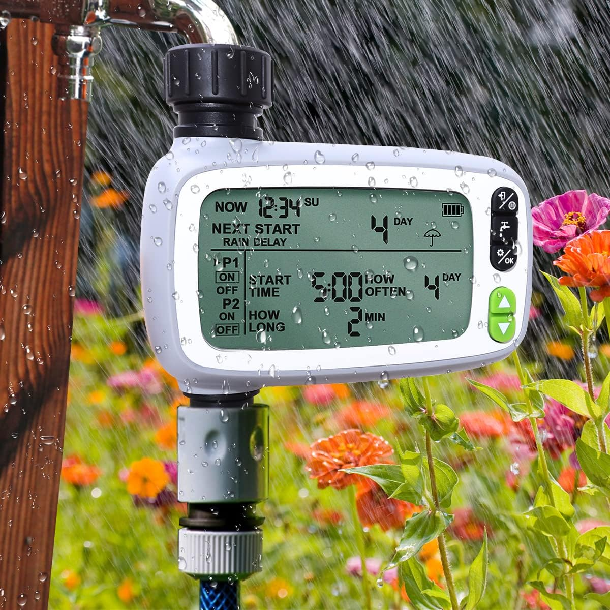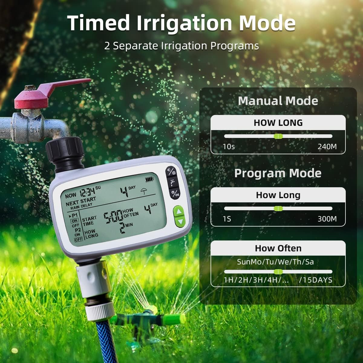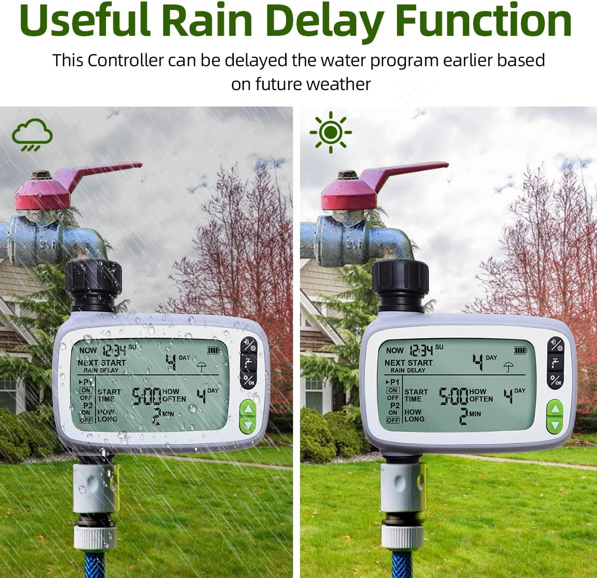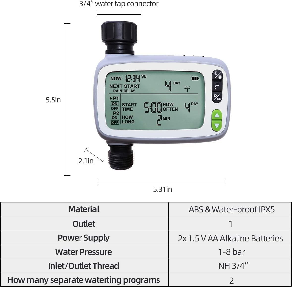 MUTI-FUNCTIONAL SPRINKLER TIMER-Electronic watering timer will water your garden and hanging baskets completely automatically according to the program you choose. 2 individual timers can be set according to your different watering needs. Set an irrigation schedule for your garden with customized irrigation frequency and duration. LEAKPROOF WATER INLET-Single-station Garden faucet water timer with solenoid valve attaches to any garden outdoor hose faucet with a standard ¾” GHS (Garden Hose Standard) thread. High-quality ABS shell makes the water timer fully waterproof. Built-in stainless steel high-density filter in the water inlet will block the impurities in the water to ensure the long-term operation of the internal structure of the controller. It can effectively save water while ensuring sufficient water for plants 4.8 INCH LARGE FSTN LCD SCREEN DISPLAY-The sprinkler Hose timer with a large LCD Screen Display that displays all the information you need to know while watering. 2x 1.5V AA battery operated (not included) allow our sprinkler timer to stably run for over 10 months. If the garden hose timer is not running within 30 seconds, the screen will automatically go to sleep to save battery power RAIN DELAY-Garden timer with rain delay function, can be connected to the rain sensor. When delay function is activated rain delay and next start keep showing on the screen. Delay time will flash for choosing (delay time :12,24,36,48,60,72 HRS). When sensor is activated timer display will show an umbrella. Rain delay function avoid overwatering and save much water in rainy days. EASY TO USE-Features a swivel coupling for easy and quick NO tools needed connection. This electronic water timer is designed for use in gardens, lawn greenhouses and more, and can control sprinklers and water systems. A modern and stylish look will not interfere with the look of your beautiful garden. Product Description Specification LCD Display Size: 3.9*2.3in Watering Duration: 10s/20s/30s/40s/50s - 240 min Watering Frequency: 1s- 300 min/ 1h - 15 DAY Ingress Protection :IPX5 Waterproof Working Pressure :1-8 bar Top Connector: The thread is made of metal Power Supply : 2 * 1.5V AA Batteries(Not Included) AUTO-SLEEP:If no operation occurs in 20 seconds the setting will be saves and return to standby mode. Rain Delay Time : 12,24,36,48,60,72 HRS You can select different start time. watering duration and water frequency for each watering program. For example: P1-Irrigate your lawn from 8:00 every 20 min for SU MO TU. please set Start Time- 8:00 How Long- 20min Weekly mode does not need to be set "HOW Often". Water for 20 minutes starting at 8 am on Sunday, Monday and Tuesday P2-Cool down the garden from 8:00 every 2 hours for 20 min, please set Start Time- 8:00 How Long-20min, How Often-2 hours If you choose HO , then the weekday you selected before will be automatically cancelled. press up and down button to set the HOW OFTEN(selection range 1h-15DAY) High-quality ABS shell makes the water timer fully waterproof. FSTN LCD screen, brighter than the conventional LCD screen, looks clearer Withstand Strong Water Pressure Manual Switch:10s/20s30s/40s/50s-240min Delay water supply according to future weather Exquisite 360° Rotation