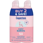 Pediatrician Recommended: From the #1 pediatrician recommended sunscreen brand(2), this Coppertone baby sunscreen is hypoallergenic and gentle UV Protection: This Broad Spectrum sunscreen protects baby's skin from up to 98% of the sun's most damaging UV rays Water Resistant: This Coppertone sunscreen spray stays on strong in the water (water resistant 80 minutes) Sunscreen Multi-Pack: This Coppertone sunscreen bulk twin pack is perfect for family fun in the sun Includes two 6 ounce cans of Coppertone WaterBabies Baby Sunscreen SPF 50 Spray INCLUDES: Two 6 ounce cans of Coppertone WaterBabies Baby Sunscreen SPF 50 Spray From the #1 pediatrician recommended sunscreen brand(2), Coppertone WaterBabies baby sunscreen is hypoallergenic and gentle. This Coppertone spray sunscreen SPF 50 protects your baby's skin from the sun with a water resistant sunscreen (80 minutes) formula that's dermatologically tested and free of PABA, dyes, Octinoxate and Oxybenzone. This Coppertone WaterBabies sunscreen for babies delivers Broad Spectrum SPF 50 UVA/UVB protection, and this spray on sunscreen is gentle on baby's delicate skin. This SPF 50 sunscreen spray is visible wherever it's sprayed, ensuring proper coverage before the sunscreen is rubbed in. Apply Coppertone WaterBabies sunscreen SPF 50 spray to your baby's skin whenever the fun takes you outside. This bulk sunscreen multi pack is perfect for family fun in the sun. Coppertone is voted the most trusted sunscreen brand(1) and each sunscreen Coppertone creates follows a tradition of trusted, quality sun protection products. Use and reapply as directed. (1)Voted most trusted sunscreen brand by American shoppers based on the 2022 BrandSpark American trust study. (2)According to IQVIA, Provoice Survey From June 1, 2021 to May 31, 2022