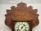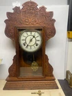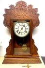 THIS AUCTION IS FOR : Antique Waterbury kitchen gingerbread shelf clock is a true gem for any collector of Victorian-era decor. Made from oak wood, glass, and brass, this clock features a glass door, half-hour and hourly gong strike, and Roman numerals. It is 22 and 1/4 inches tall, 14 and 3/4 inches WIDE , and 4 and 1/2 inches DEEP. The clock is in perfect working condition and is an original piece from the 1850-1899 time period. CLOCK DOES HAVE A SMALL NIC ON FRONT TOP PC, SEE PIC. NOTHING MAJOR. GOOD RUNNNING CLOCK SELLING USED AS IS CONDITION, ANY QUESTIONS PLEASE ASK, THANKS FOR LOOKING. BE SURE TO CHECK BACK, LARGE ESTATE OF CLOCKS AND PARTS TO BE LISTED. FREE U.S. SHIPPING.