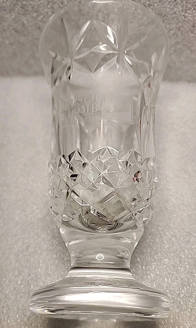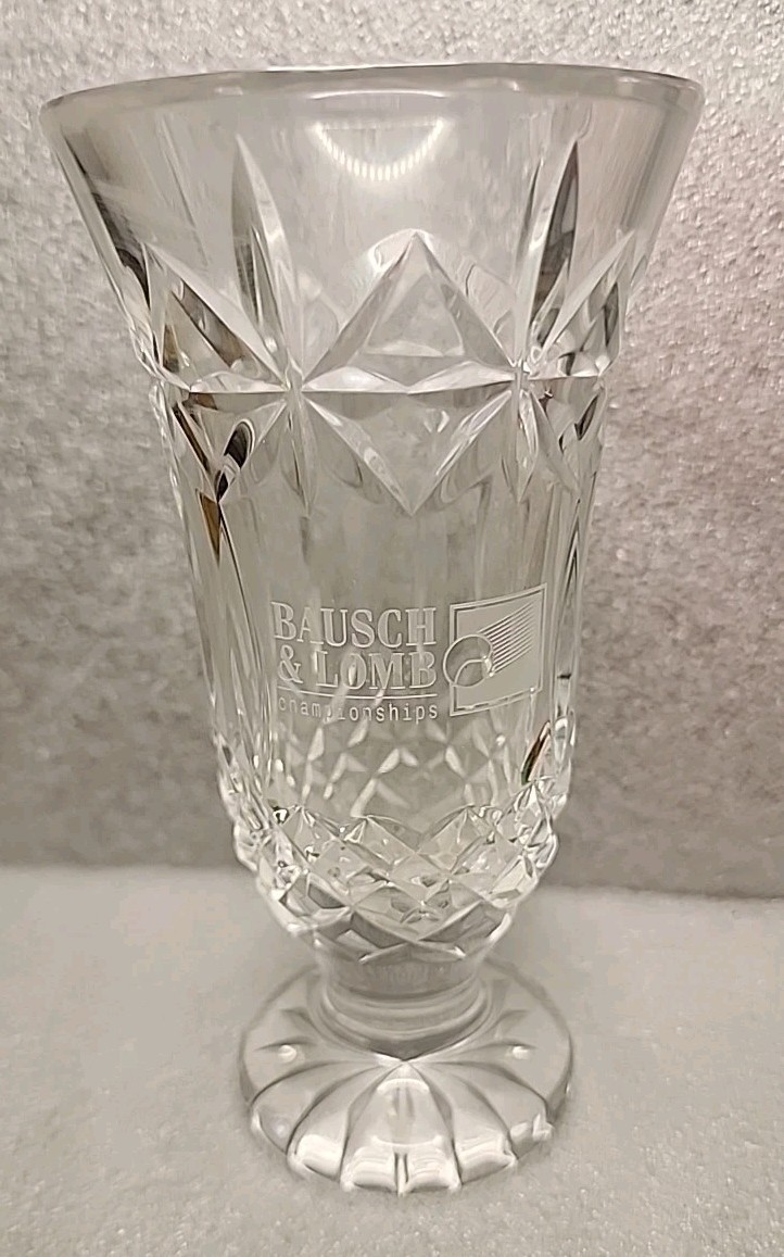 Crafted by the renowned Waterford brand, this 7-inch Balmoral vase is a stunning piece to enhance your home decor. The vase showcases the classic Balmoral pattern, expertly molded from premium crystal material. Its clear construction allows for versatility in placement, complementing any room with a touch of elegance. The vase's intricate design embodies Waterford's commitment to quality and style, making it an ideal addition for those who appreciate fine crystal craftsmanship. Whether displayed alone as a statement piece or used to showcase fresh blooms, this vase is sure to catch the eye and elevate the sophistication of your space. Has bausch & lomb Championships on glass see pics