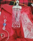 This Waterford crystal ornament is a beautiful addition to any Christmas collection. The baby's 1st Christmas bottle ornament features an all-over pattern with a bottle shape and a hanging design. The ornament is etched with delicate details and comes with two beaded decorative hooks in pink and blue, as well as a crystal ornament. This original Waterford ornament was manufactured in Germany in 2005 and is part of the baby's 1st Christmas collection. It measures 3.5 inches in height and 1 inch in width, making it a small and delicate piece. Perfect for any occasion, especially baby showers, this ornament is a great way to celebrate the arrival of a new baby. No date on the bottle.