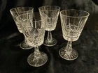 The Waterford Crystal Kylemore Water Goblet is a set of four 6 3/4" tall stemmed water goblets, made from crystal and hand-blown in Ireland. These elegant water goblets are perfect for serving cold beverages on all occasions, with a classic clear color and intricate Kylemore pattern design. Designed by the renowned brand Waterford, these water goblets are a beautiful addition to any kitchen or home decor collection. One married - no damage. One unmarked - no damage. One chip in base - see picture - not marked. One small crack - see picture - not marked.