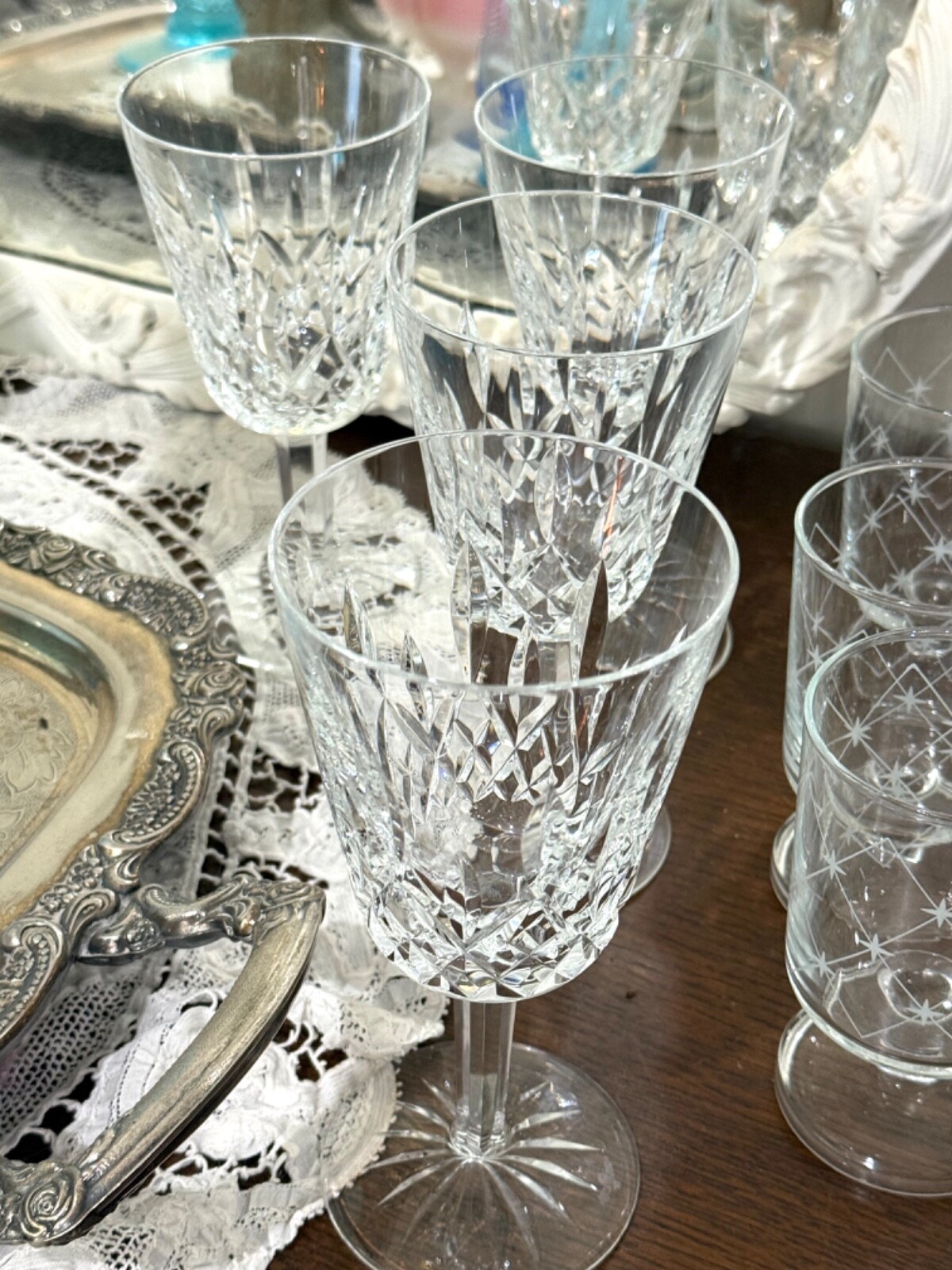A beautiful set of 4 Waterford crystal wine goblets or water glasses in the Lismore pattern. Even prettier in person. Please email us with any questions and please check our Ebay store, Hooked-On-Vintage, for more great vintage items. We combine ship :-)
