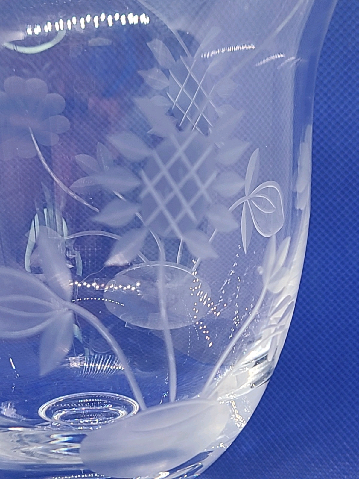 Elevate your dining experience with the Waterford Great Room Crystal Chamomile Etched Water Goblets. This set of four exquisite pieces, crafted in 2004, brings a touch of elegance to any table setting. The intricate chamomile etching adds a delicate floral motif that is sure to impress your guests and make every sip a memorable occasion. The clear glass material of these goblets allows you to view your water or beverage effortlessly, making it a practical as well as stylish choice for your drinkware collection. As a vintage set from the renowned brand Waterford, they reflect a timeless design and quality craftsmanship. Perfect for special events or everyday use, these water goblets are a must-have for those who appreciate fine crystal glassware.