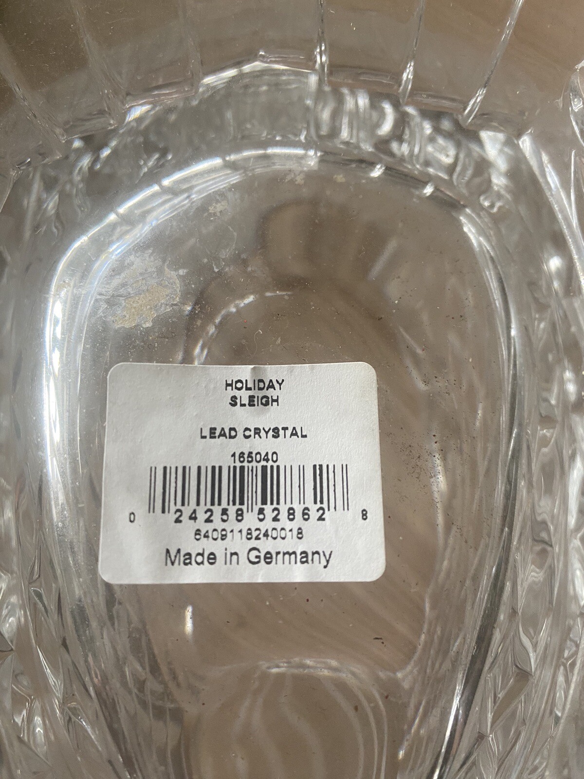 New crystal sleigh 10” long, 5.5 “ wide 4” base. Fill with anything all year round! Original red Marquis label .