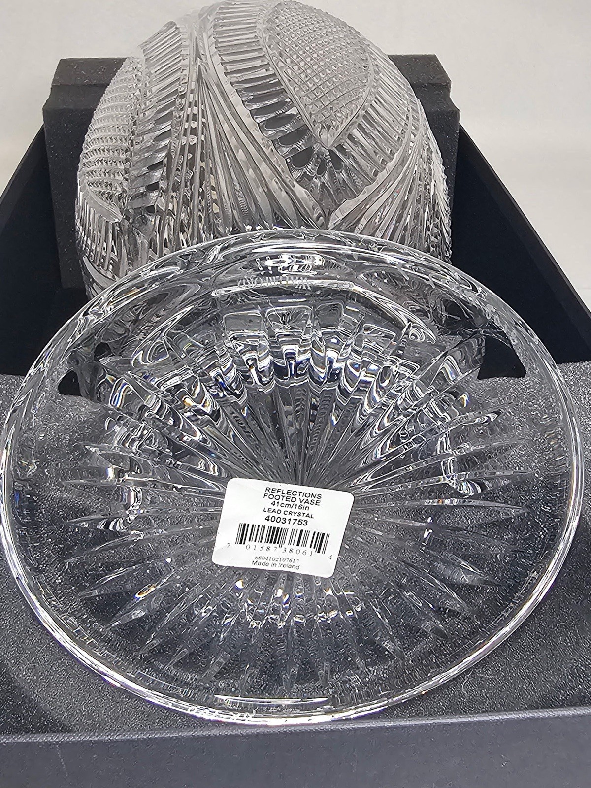 Designed by Martin Ryan, the beautiful Reflections limited edition collection is inspired by his deep affection for the rich diversity of the Irish countryside with its leafy woodlands, sparkling streams and rugged coastline. The collection features deep faceted patterns of sparkling diamonds and cascading olive cuts. The Vase 16" is a limited edition Number 52 out of 100 pieces and handmade at the House of Waterford Crystal, this popular footed shape makes a beautiful statement. Features: Crystal, Hand Wash Recommended, No Color, Linear.