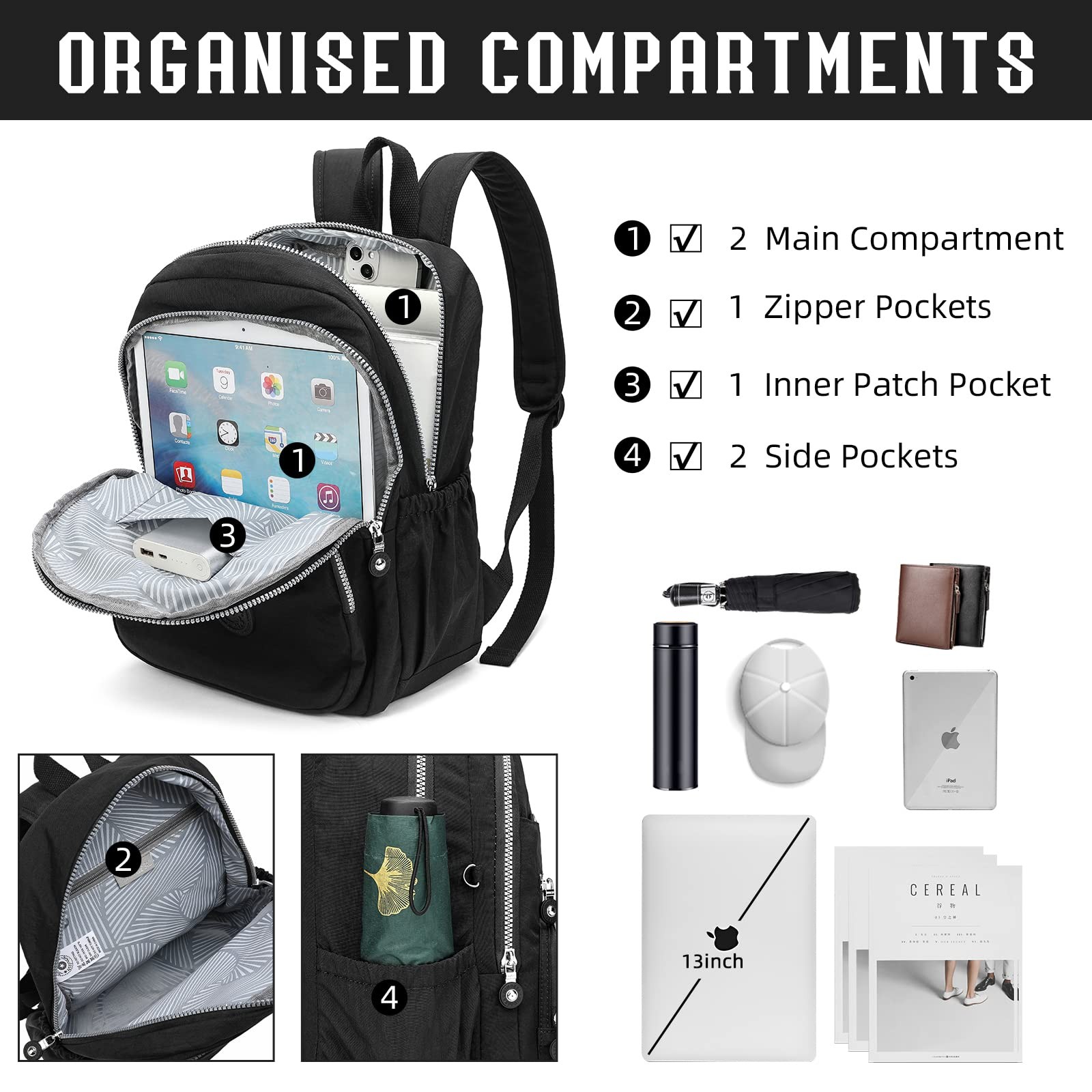 women mini nylon waterproof backpack 【QUALITY WATER-PROOF FABRIC】The stylish travel backpack is made of durable water-proof polyester fabric. Padded shoulder straps with reinforced sewing ensure the backpack sits comfortably and can carry heavy loads. 【ORGANIZED DESIGN】It features various external and internal compartments, pockets, very convenient to keep your daily items organized, as well as easy access to them. The seperate rooms make the backpack fit all of the stuff you need, such as tablet, up to 13" laptop, books, clothes, snacks or even lunch box, etc. 【APPROX DIMENSIONS】10" L x 5.9" W x 13.8" H Weight: 1.1Lbs. The laptop compartment can fit up to A4 folder and 13" laptop. 【APPLICATION SCENARIOS】Smart and functional design, the backpack can be used for college, hiking, travel, etc.. 【IDEAL GIFT】Practical new year, Christmas, or birthday gift for friends.