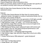100% Brand new and high quality. Product Shape/Color: Same as the picture show Before you purchase, please confirm the type and other item specifics of our products correctly match what you are looking for. 8LED Car Rear View Camera Reverse Car Rear View Car reverse parking waterproof camera Features: 1. Car Rear View Camera Reverse Car Rear View Car reverse parking waterproof camera that apply to a variety of automotive brands, such as for Nissan, Ford, Toyota, Honda etc. 2. 8 LED Lights: The camera with a new generation of LED lights, provide you a great performance in dark space to guarantee safe driving 3. High Definition Image: 110° angle + 1/4" PC7070 chip make it a high-definition image effect and wide view to ensure all angles to be recorded, no blind area when parking 4. IP68 Waterproof Rating: Super waterproof make it still normal work under soaked in the rain. Also great shockproof performance is still functioning properly on rough roads 5. 8 LED Lights: 8 LED + 110°viewing angle horizontally 6. High Quality Image: High-definition image effect, ensure your safety even at night. 7. Product Performance: IP68 waterproof + great shockproof Specifications: 1. Item Type: Car Rear View Camera 2. Image Sensor: 1/4"" PC7070 3. TV System: NTSC 4. Lens Angle: 90°-170° 5. Effective Pixels: 928H*520V 6. Resolution (TV line): 420 TV Lines 7. IP Rating: IP68 8. Anti-Shake: Yes 9. Video Output: RCA 10. Power Consumption: Max0.5W 11. Power Supply: DC 12V 12. Lens Material: Glass 13. Camera Material: ABS 14. Wire Material: PVC 15. Item Weight: Approx. 0.85 Oz 16. Operating Temperature: -4℉~ +167℉ Easy to Install: Step 1: Using the hole saw to drill a hole in your car's license plate area or other suitable places, then install the car rear view camera. Step 2: Adjust the lens of camera to its best position. Step 3: Connect power wire (Red and Black) to car’s power system and video output (Yellow wire) of camera to car’s display. Package Included: 1 * 8LED Car Rear View CDD Camera 1 * Power Cable 1 * Hole Saw 1 * User Manual -About US Founded in 2012, VIPJQ have professional development and sales, and are involved in various products, providing customers with various high-quality products. Since its establishment, VIPJQ has always adhered to the service concept of "customer first" and the management concept of "pursuit of quality", and is committed to providing customers with high-quality original designs. We commit to provide you the best innovative, quality products & professional services with competitive prices. We value every customer, and we look forward to providing solutions for your business needs to help your business achieve its goals, please contact us immediately! We are all about you! We are a Japanese seller,but with large warehouse in USA. We are profesional on Auto Parts,Car Parts,Motorcycle Parts,3C,other hot sale items and so on. We aim to provide to customers high quality product and best service. -About Shipment&Returns The item usually will be dispatched within 3 days after you ordered.All are free shipping. And it usually takes 3-10 working days to delivery depends on buyers' address or other majeure on the way. If you are not satisfied with the items and want to return the item,we hope you could message us first,we will give you the return details, we think we could give you the best service to save your time and money.Thank you. -About Feedback&Customer Service If you are enjoy your shopping here,not only enjoy the items but also the service,we are appreciate you could give us a 5-star feedback. If you are not satisfied with the item,before you give us the negative feedback,we hope we could give you the best solution through our commutication. We think we could do it if you give us the chance.Thank you.