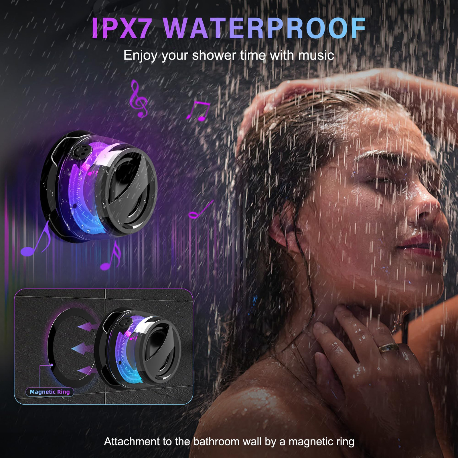 IPX7 WATERPROOF: This waterproof shower speaker has IPX7 waterproof protection, so whether it's raining, snowing, or completely submerged in water, this wireless speaker will keep working. You can use the included magnetic ring to magnetize the Bluetooth headphones to your bathroom wall. Enjoy your shower music time. No need worry about the weather and outdoor conditions, enjoy the freedom of outdoor activities and the rhythm of music. 2 IN 1 BLUETOOTH SPEAKER & STAND: The cell holder frees your hands, the wireless Bluetooth speaker makes your cell sound louder and clearer. Magnetically attaches to the back of your as a stand for watching movies, video chatting and playing music. This is a creative small gift. UPGRADED BLUETOOTH 5.3 & TWS PAIRING: Next-generation Bluetooth 5.3 chips with better, more stable signals and higher transmission rates for reliable connectivity. TWS pairing supports simultaneous connection of two bluetooth speaker. Forms a wireless 360-degree sound system. Provides you with true movie theater surround sound. The small bluetooth speaker supports connection to any device such as smartphones, laptops, etc. Stable wireless connectivity over a range of 33 feet (10 meters). 3D STEREO SOUND: This waterproof bluetooth shower speaker is crisp and clear, delivering clear, rich 360° full-range sound. Music mode enables full-range listening with the equalizer adjustment function. Game mode features powerful bass and low latency to immerse you in the game. RGB LIGHT SHOW & ULTRA PORTABLE: Wireless Bluetooth speaker with different light modes. Cool light effects can jump and change with the beat of the music. Like an elf in the night to add to the ambiance of your party. Its compact design makes it easy to carry. You can put this mini speaker anywhere such as a backpack, suitable for traveling camping and other outdoor activities.