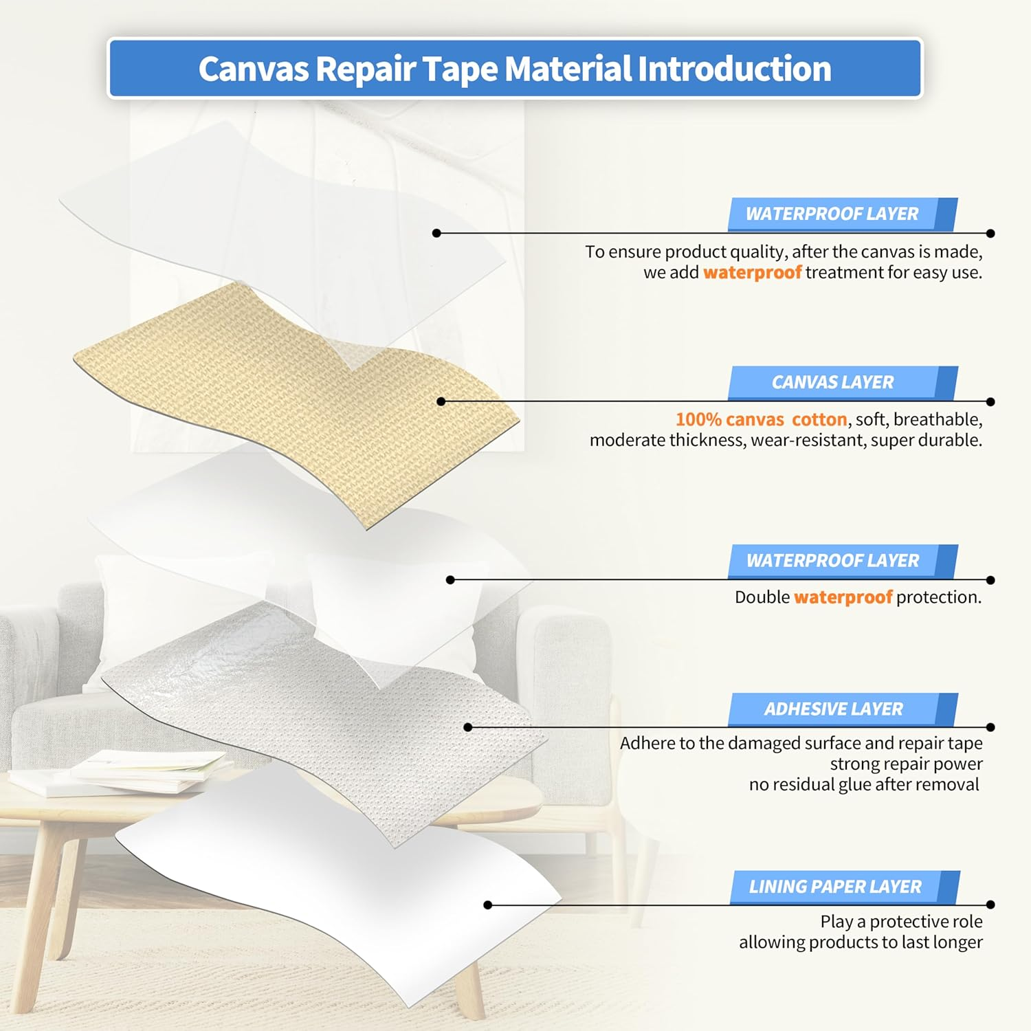 Waterproof Cotton Canvas: The self-adhesive canvas outdoor repair tape is made of high-density canvas material that is wear-resistant and scratch-resistant. The fabric surface is coated with a waterproof layer, providing excellent resistance to water penetration, making it suitable for outdoor use. The patch has a thickness of 1.2mm, which is moderate and flexible, allowing it to blend well with outdoor equipment such as umbrellas and tents, and can last for an long period. Professional Repair Adhesive: The backing adhesive is made of fabric-specific adhesive, which is 20% more adhesive than other transparent repair tapes, ensuring stronger adhesion and reducing the chances of detachment. The smooth repair process and longer lifespan of the canvas patch allow for easy repair of damaged outdoor gear by simply peeling and sticking, providing a fast and efficient solution. Wide Applications: The canvas repair patch is suitable for repairing various outdoor gear, such as tents, sunshades, awnings, sails, sofas, and more. It can easily refurbish and repair scratches, holes, cracks, and other damages, eliminating the need to purchase new furniture or outdoor gear. The lightweight packaging allows for easy carrying and storage. Instructions for Use: Ensure cleanliness and dryness of the damaged area, then cut the patch to the appropriate size. Peel off the backing paper and apply the patch to the area that needs repair, completing the process. This quick and convenient method saves a significant amount of repair time and helps you solve your problems effortlessly. Better Customer Service: For every set of canvas repair kits sold, we offer full exchange or refund if you are unsatisfied with our products for any reason. Due to slight color variations caused by different screens and photo shooting, you may choose the wrong color. We display our full range of color options on the detailed information page to assist you in making a better choice. If you're still unsure, please don't hesitate to contact us for assistance. Product Description KING MOUNTAIN CANVAS REPAIR PATCH Best Solution for Canvas Repair KING MOUNTAIN Canvas Repair Patch Product Introduction Canvas Repair Patch, specially made for canvas material items damage, tear, holes, burns, fading, peeling, pet scratches and other damage repair, easy to operate, so that your canvas items look new, can be used on sofas, recliners, outdoor supplies, tents, sunshade and other canvas products, no additional use of glue, simple operation, easy to use, rapid repair, is the best choice for your canvas repair needs. Product Features Pure Cotton Canvas The canvas is made of pure cotton, wear-resisting, soft, breathable, no peculiar smell, the surface of the canvas is coated with a water proof layer, which can achieve waterproof result. Strong Glue The glue is the most important part, So we choose good self-adhesive, 20 percent more than the conventional product glue content.And which has stronger repair power. Rich Colors In order to meet more color needs, we provide a variety of color options. Designed to Repair Textile Fabrics Canvas Repair Patch can be a good repair for such as cotton, linen, flannel and other material, adhesive stability,suitable for uneven or curved surface,long-term use, do not fall off, no warped edge. Simple and Fast Repairing Power Customer Genuine Feedback Wide Applications What to do when I can't decide on the best color for me? We offer a free color matching service. Just take a picture of the sofa you need to repair and send it to us. We will pick and recommend the best color for you. Is this flexible enough to stick over curved surface? Yes. It will work well on uneven surface as well, like the top of our chair is curved and it works fine, and it also covers the arm of the chair with no problems at all. Please enjoy. Thanks again. Does the glue fall off easily? Our glue is a special glue for Canvas repair, it is very strong after application, please feel free to enjoy it. Is the Canvas surface waterproof, sweat resistant, breathable,easy to clean? It is wear-resistant, waterproof, breathable,you only need to wipe the surface gently with a wet cloth. It is very easy to clean, and there will be no color loss or fading. What is thickness of the sheet? This product is ultra-thin, with thickness of 0.6 mm only.