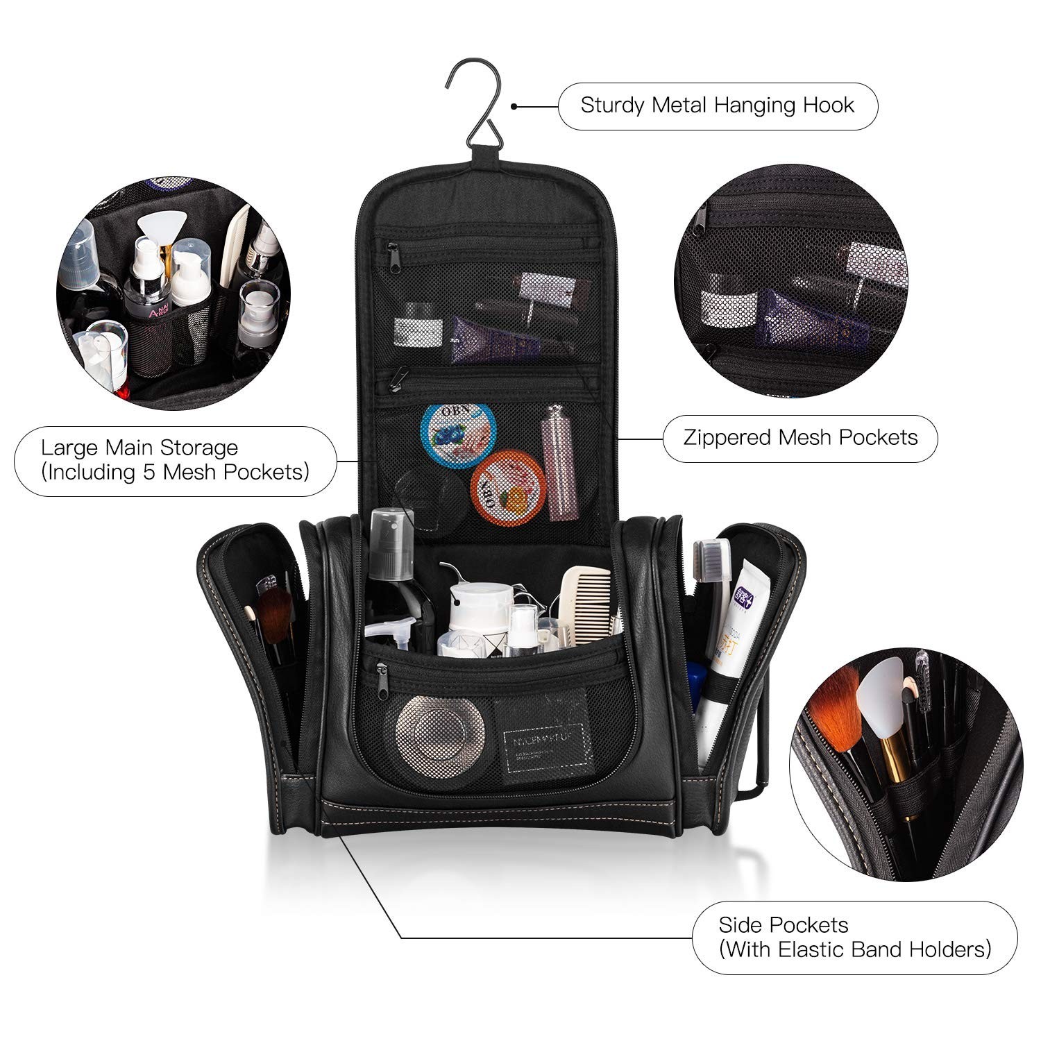 Plenty Room for Storage -- This dopp kit features a main compartment for large items such as shampoo bottles or shaving cream. Equipped with 3 zipper mesh pouch, 5 mesh pockets and 2 side pockets with 5 elastic loops, this is the ultimate men toiletry organizer bag. Leather & Waterproof Lining -- This exceptional toiletry bag by MIRASON is made of high grade hard-wearing PVC leather, with nylon inner lining and water resistant inner bottom. Easy to clean and 100% leak-proof. Multiple Use -- It can be hung on the door or other indoor and outdoor places with the sturdy metal hook. With the quality durable fabric,this travel toiletry bag can remain in shape and sit on the counter even empty. Easy to carry with the creative thickened handle, suitable for daily use or travel. Large Capacity -- Shower travel bag size: 11.5"x 4.5" x 7.9", with wide open design to help you keep toothpaste, toothbrush, mouthwash, deodorant, razor, extra blades, shaving cream, shampoo/conditioner, soap, makeups, etc in place. Quality Zipper -- Double zip closure, stronger and smoother. Mens toiletry travel bag equipped with mesh pockets and side pockets to keep your toiletries protected and organized during travel. Perfect gift to last a lifetime. The Hanging Toiletry Bag for Men Dopp Kit is a stylish and practical travel accessory designed for men. Made from waterproof leather and polyester material, this black bag is compact with dimensions of 11.5 x 4.5 x 7.9 inches and weighs 15 ounces, making it easy to carry on the go. With its hanging design, this toiletry bag is perfect for organizing your grooming essentials while traveling, ensuring that everything stays neat and tidy. Made in the United States, this high-quality bag is a must-have for any man looking to stay organized and stylish while on the move.