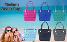 Medium Beach Bag, Waterproof Rubber Beach Bag, Washable Open Tote Bag Durable Tote Travel Bags for Outdoor Sport MEDIUM BEACH BAG: The beach bag size are 14.5*12.8*6 inches (trapezoidal in shape, note that 14.5 inches is the length of the top edge, while the bottom edge measures 12.8 inches). This tote bag is large in space and spacious design holds many towels for snacks, sunscreen, body wash, slippers, and more, all in one bag for everything you need for fitness or play. EASY TO USE: The holes on the beach bag are about 10mm in diameter, so you can add your favorite decorative pendants. The bag stands upright and will not fall over. The traction on the bottom of the bag prevents the bag from slipping on wet surfaces. DURABLE MATERIAL: Rubber beach bag features high-quality durable material, treaded non-slip bottom, Sturdy sides, and soft shoulder straps. Very strong durable and dries instantly. EASY TO CLEAN: Dirty and grime on surfaces, handles, and liners can be removed quickly for easy cleaning. Easy care, simply rinses off the sand, spilled drinks, mud, and mess for a bag as good as new every day. WIDE APPLICATIONS: This beach bag can hold all the items needed for any scenario, such as fitness, camping, beach games, and swimming. Includes 1 clear accessory bag that pops into the holes anywhere inside or outside of the bag to keep smaller items within reach.
