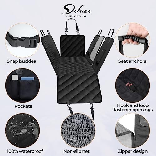 YSSOA Dog Car Seat Cover for Back Seat, Durable Waterproof Nonslip Pets Hammock with Mesh Window and Storage Pocket, Suitable for Cars, Trucks, SUVs, Standard About this item: Universal Fit for Most Ve hicles: 54" W x 58" L, designed for most cars, trucks and SUVs. It can be converted from a rear-seat hammock to a fitted back-seat cover, or a trunk cover, etc. Durable with Side Flaps: Made of 600D Oxford fabric with a waterproof coating, the side flaps can protect not only your backseat and the car door from scratches but also make it easy for your dog to get in and out of the car when the side flaps are lowered Mesh Window & Storage Pockets: The upgraded mesh back allows easy visibility between you and your pet, ensure airflow during drive. Three additional pockets are available to store your pet's toys, reducing anxiety Pet-Friendly: Our seat cover comes with a free dog safety belt to be used in conjunction, preventing your pet from getting injured during sudden braking or sharp turns. The pet car seat cover is a great gift for every pet lover Easy to Clean and Install: Machine washable and quick-drying, this dog mat can be cleaned effortlessly. It can be easily installed in just one minute, providing convenience and comfort