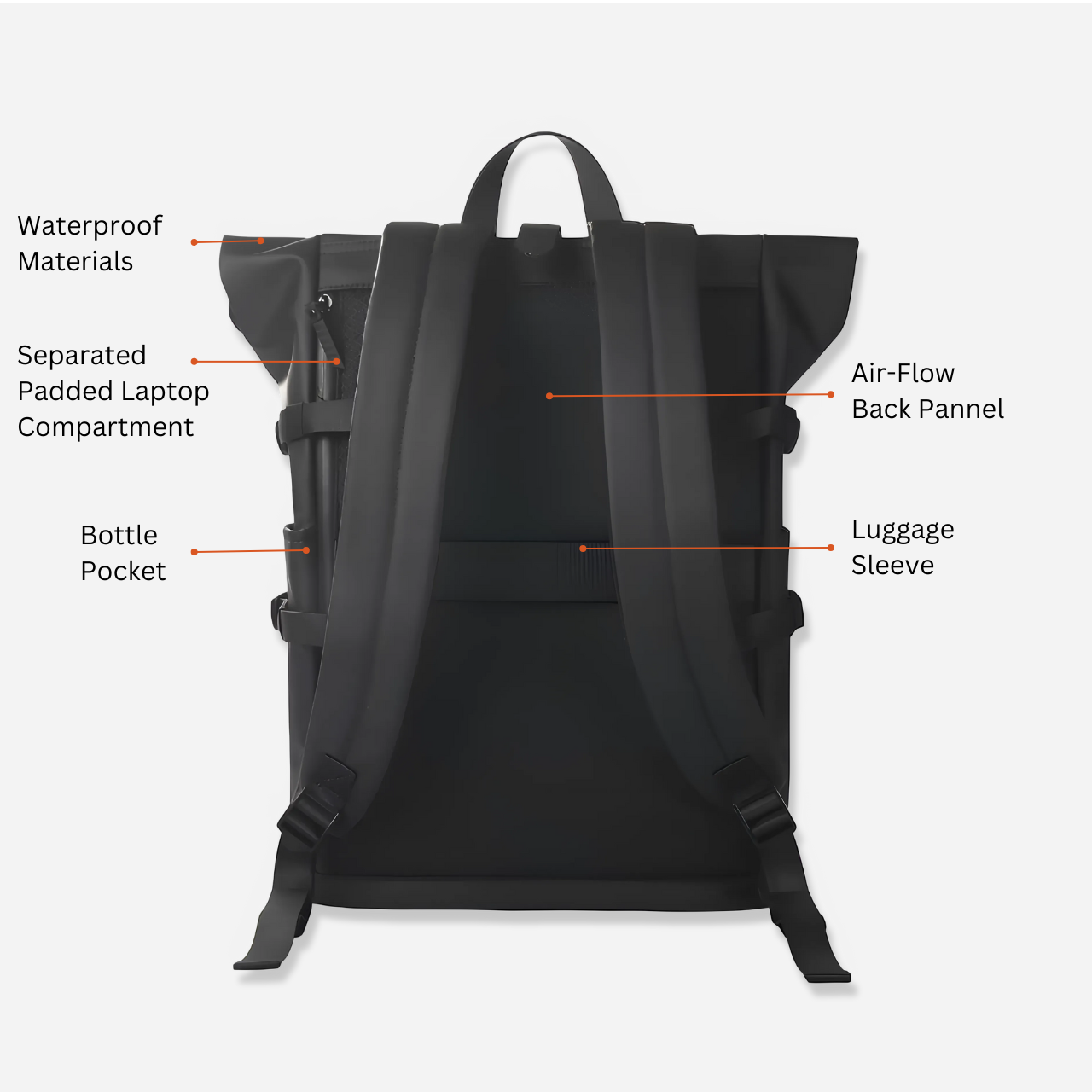 This backpack is a game-changer! The water-repellent material keeps my stuff dry, and the roll-top design adds extra security. Super comfortable for all-day wear, whether I'm commuting or hiking. The laptop sleeve fits my 15" laptop perfectly, and the luggage sleeve is a nice touch for travel. Love the sleek black look—stylish yet functional. Highly recommend for anyone who needs a reliable, versatile bag!