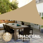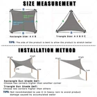 Descriptions: The Waterproof Sun Shade Sails Perfect for gardens, patios, swimming pools, BBQ areas and etc. Give you a cool and comfortable experience in the hot summer. It can also create a good mood for you in Rainy days. 【WATER RESISTANT】Sun shade sail is 300D high density polyester fabric with PU coating(160 g/m²), can withstand 2000MM water pressure. It's tear resistant, waterproof and weatherproof. But we don't suggest to use shade sail in heavy rain, continuous heavy rain may cause slight water seepage. 【MULTIFUNCTIONAL & DURABLE】Double stitched edges and reinforced corners, making both sides more robust. Our solar sail is suitable to be used in garden, backyard, patio, courtyard, carport, pergolas, swimming pool, balcony, terrace, camping trip, lawn or another outdoor area. Protecting your privacy safe. 【EASY TO INSTALL】Durable anti-rust D-ring is placed at the edge of the four corners, you can use ropes or fixing kits easily to fix it. We recommend that you adjust the angle of the garden shade sail to 20-40 degrees, it needs a certain angle to drain the rain to avoid damage the product due to excessive water. 【UV PROTECTION】Our outdoor awning can block 95% harmful UV. It can provides excellent shade on sunny days/rain days, give you a wonderful space to enjoy your time. 【PAKAGE CONTAIN】You will get Awning Canopy x1, Ropes x4/3 . Specification: Type: Waterproof shade sails Material: 300D Oxford cloth Material of D-Rings: Stainless Steel Color: Grey, Cream, Beige, Orange, Blue, Anthracite, Sand, Green, Terracotta Shape: Rectangle/Triangle/Square Ropes Length : 1.5m / 4.92 ft Features: Stainless Steel D Rings, Waterproof Waterproof Materials 160 gsm high density polyester with PU coating, water and tear resistant. The material is waterproof and can be protected from water even on rainy days. The material is more sturdy, thick fabric and braided rope, good windproof effect. High Quality Materials 95% UV protection Strong and high-quality materials, can be used in sunny and rainy days, not recommended for use in bad weather UV Protect This sun shade sail has a sunscreen coating that effectively prevents UV rays, blocks the sun, and prevents tanning.95% anti-UV effect, effectively blocking UV rays. Multiple Sizes in Varied Shapes: ## Triangle Sun Shade Sails Size ## 2 x 2 x 2M / 6.56 x 6.56 x 6.56 FT 3 x 3 x 3M / 9.84 x 9.84 x 9.84 FT 3.6 x 3.6 x 3.6M / 11.81 x 11.81 x 11.81 FT 5 x 5 x 5M / 16.40 x 16.40 x 16.40 FT ## Rectangle Sun Shade Sails Size ## 2 x 3 M / 6.56 x 9.84 FT 2 x 4 M / 6.56 x 13.12 FT 3 x 4 M / 9.84 x 13.12 FT 3 x 5 M / 9.84 x 16.40 FT 4 x 5 M / 13.12 x 16.40 FT 4 x 6 M / 13.12 x 19.68 FT ## Square Sun Shade Sails Size ## 2 x 2 M / 6.56 x 6.56 FT 3 x 3 M / 9.84 x 9.84 FT 3.6 x 3.6 M / 11.81 x 11.81 FT Package include 1x Waterproof shade sail with 3/4 Ropes The edge of the shade sail is curved, and the actual use area is about 10% less than the measured area. Please purchase with cautious,thank you. 【How-To Install a Shade Sail 】 The shade sail came with D ring & Wind ropes for you to be able to make the connections to the house/trees/other structure pretty easily. If you want to strengthen the fixing, you can buy a set of hardware from our store. How-Totighten the rope after installation/Buyer's Experience Sharing From the opposite corners, I assembled the proper length of wire rope with the thimble and clamp for the end, and attached to eye bolts in the trees with a turnbuckle to tighten the span. Once I had these four anchor points established and installed, the shade sail was in the proper position and I could tighten all four anchor points to get the desired tension.