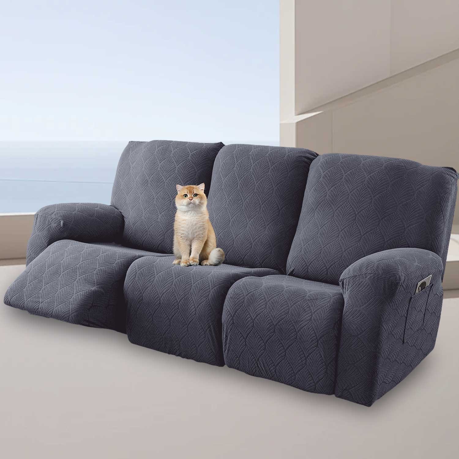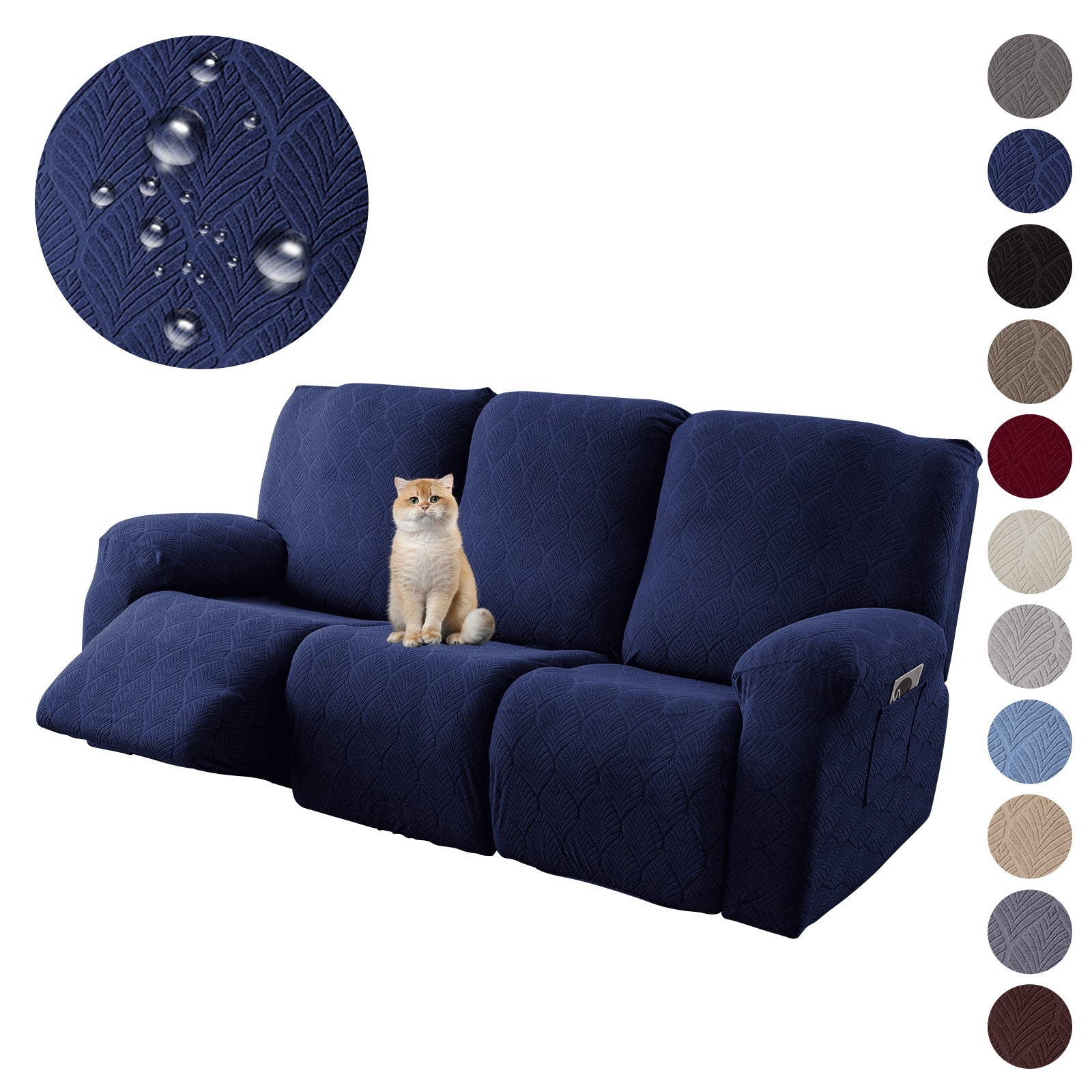 Material: Our leaf pattern recliner slipcovers are made of waterproof technology fabric that protects your sofa from accidental spills and everyday stains. Ideal for families with children and pets. Tips: Not completely waterproof (spills on sofa cover should be removed immediately) Packing list: Solid color 8-piece recliner cover includes 3 seat covers, 3 back covers and 2 arm covers. Suitable for sofa seat width 69-91 inches. Non-slip recliner cover: Personalized design, more than the ordinary one-piece recliner cover. We also come with a thick elastic that covers the bottom edge nicely for full protection, so you don't have to adjust after sitting. Easy to install (reference photo on product page). Full protection: Our farmhouse solid color recliner covers are designed with full coverage to protect your recliner from all sides. Our recliner covers come with side pockets for easy storage on your recliner. Maintenance instructions: cold water gentle machine wash. Do not bleach. When drying, use roller to dry at low temperature or sun dry or air dry.