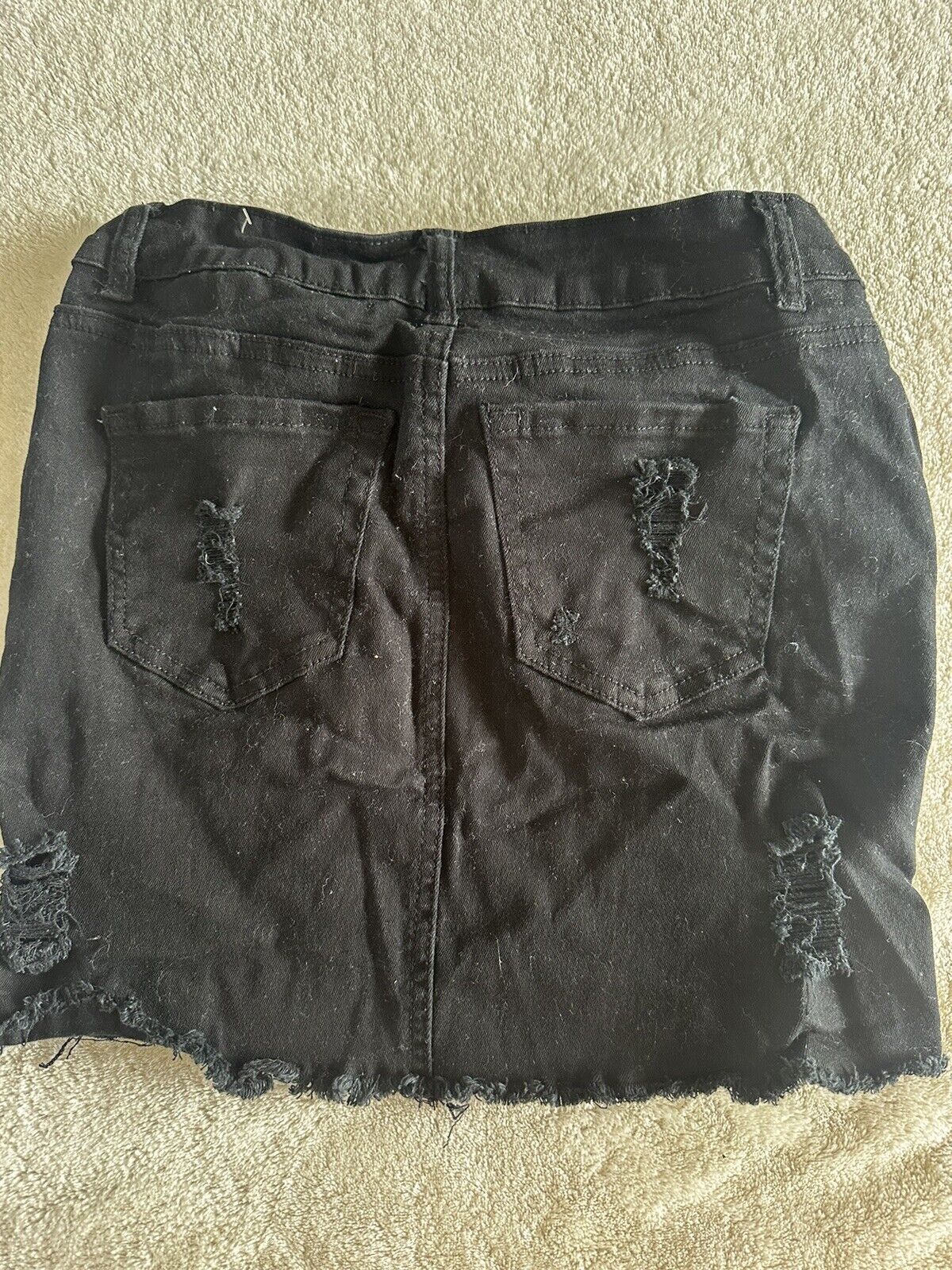 This skirt screams "I'm cool, but I didn't try too hard." Perfect for coffee runs or pretending you know about art at a gallery. • Distressed design with frayed hem • Functional front and back pockets • Zipper and button closure • Mini length for trendy style Slight fraying near seams adds to the distressed look. Top to bottom = 15 inches, waist = 13 inches across.