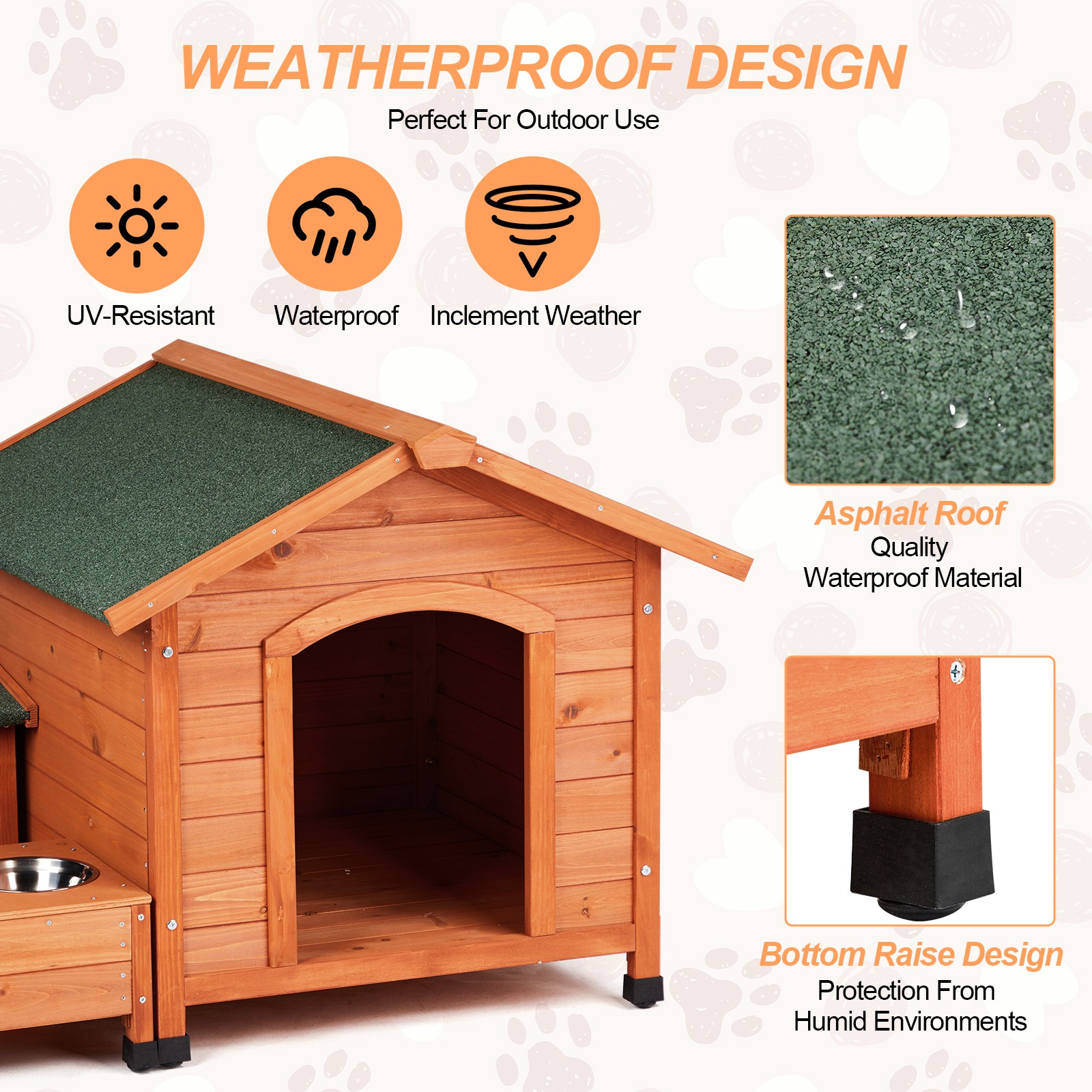 Outdoor Wooden Dog House with Asphalt Roof, Storage Box & 2 Bowls