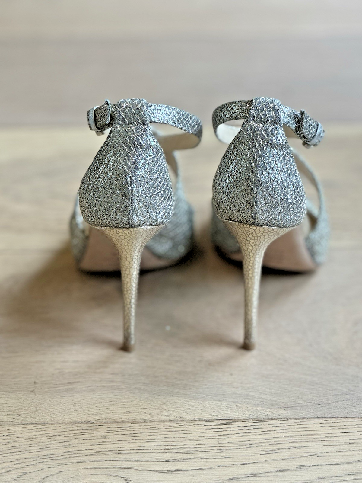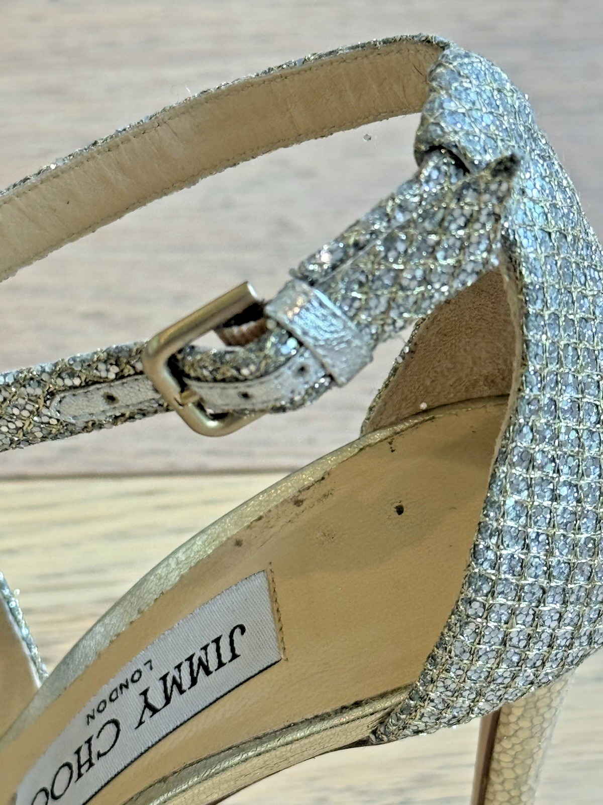 Jimmy Choo “Azia” glitter heels – the ultimate mix of silver and gold sparkle that goes with everything . Size: 6.5 Heel Height: 95 mm (≈ 3.7 in) – elegant stiletto Condition: Worn once for a special event – soles show minimal wear, uppers look flawless Retail Price: $950 These stunning strappy sandals are perfect for: ✔️ Weddings & special occasions ✔️ Holiday parties & black-tie events ✔️ Elevating a night-out look Comes from a smoke-free, pet-free home . Ships fast & securely.