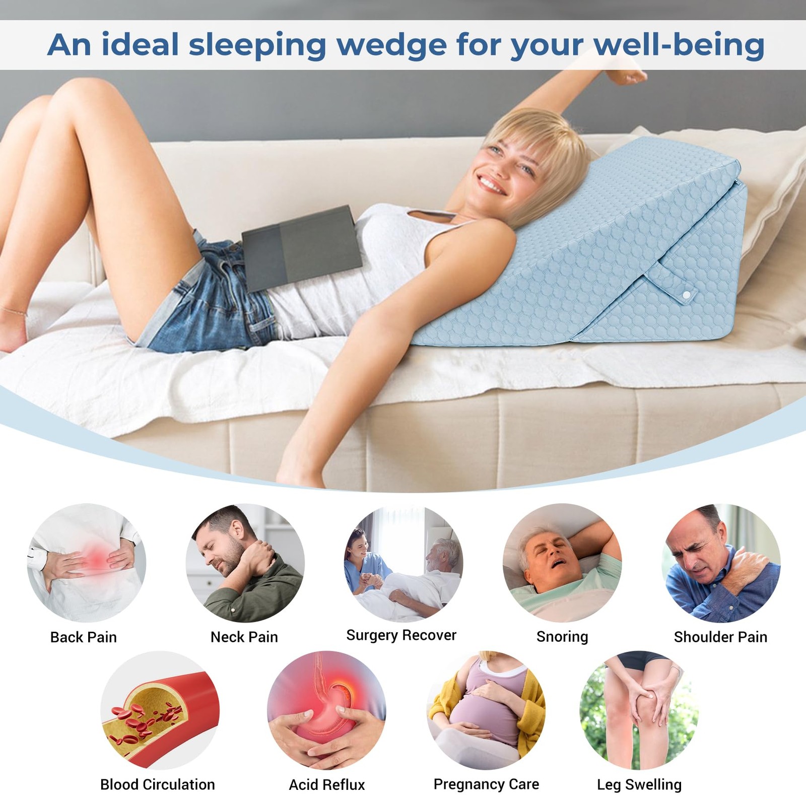 Ergonomic Bed Wedge Pillow: With Its Premium-foam base and 1.5-inch layer memory foam, the bed wedge is soft, yet supportive, It remains uniform in density and conforms to your shape to reduce pressure points, help increase blood flow and provide the support, comfort and alignment you need for a comfortable and restful sleep - Foam wedge specifically designed for ultimate relaxation. Versatile Folding Pillow Wedge: The triangular wedge pillow, suitable for snoring, is foldable and adjustable. It can easily adjust the height (9 and 11 inches) and angle, making it perfect for supine and lateral lying. It can provide extra support when learning, watching TV or reading Premium Bed Wedge Pillow: The ergonomic wedge pillow is made of premium-25D memory foam, which is comfortable and breathable, wedge pillow for sleeping has been certified by CertiPUR US and OEKO-TEX, which is safe and hypoallergenic Friendly-design for Pain : Supportive and elevated post-surgery wedge pillow helps you reduce snoring, relieve back pain, acid reflux and breathing issues, improving blood circulation and . Ideal wedge pillows for after surgery and sleep apnea, providing more comfortable night's sleep for you Breathable & Removable Zippered Cover: The bed wedge pillow has a removable soft and breathable air layer pillowcase, which can be washed by hand or machine. Besides, with a handle, our foam wedge pillow is easy to carry and move around Good Choice: If you struggle to sleep at night, this wedge pillow for sleeping is a good choice for you, it can help you solve the problem. Whatever concerns about the wedge pillow you have, we provide for you and reply within 24 hours