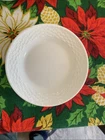 Add a touch of elegance to your dining table with this set of four Wedgwood Nantucket basket weave bread and butter plates. These plates measure 6 inches in length and width and feature a beautiful white bone china material with a painted backstamp. The plates are dishwasher safe, making them perfect for use on any occasion. The round shape and basket theme of these plates make them a great addition to any decorative cookware, dinnerware, or serveware collection. They were manufactured in England in 1986 and are an original Wedgwood product. This set includes four bread and butter plates and is perfect for all occasions.