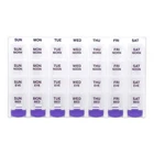 Weekly 7-Day Pill Organizer 4 Times a Day Push Button Pop-Out Travel Compartment Description: This Push-Button One-Day-At-A-Time Pill Planner makes it possible to organize daily medications and take them with you for the day. A push-button on the bottom of each day easily releases the 4-compartments. Features: 【 7 Day Pill Organizer 】Weekly pill sorter helps you to easily plan and distribute your daily doses 【 Easy To Use 】 Push buttons and rounded bottoms, Makes pill organizer easy to open and medication easy to retrieve 【 Pill Capacity 】Holds up to 11 pills per compartment (aspirin-sized) 【 Built To Last 】Quality design, Built to withstand repeated use 【 Healthy Living 】This products make living healthier simply easier, Many products endorsed by the Arthritis Foundation Specifications: Weekly pill sorter helps you to easily plan and distribute your daily doses Push buttons and rounded bottoms, Makes pill organizer easy to open and medication easy to retrieve Holds up to 11 pills per compartment (aspirin-sized) Quality design, Built to withstand repeated use Arthritis Foundation Certified Assorted Colors Package Include: 1* Pc Pill Organizer