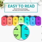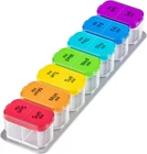 Weekly Large Pill Organizer 2 Times a Day AM PM Pill Box Container Multi-colored Description: [ Easy to Track ]: Weekly pill organizer 2 times a day, morning and evening compartment, can help you better plan a week of medication, each day corresponds to a color, Transparent material, you can clearly see the medicine supplements, so you no longer forget to take medication and timely refill. [ Extra Large Compartment ]: Pill box 7 day with 14 jumbo AM/PM compartments that can hold large pills such as cod liver oil, enough for your week's worth of med, perfect for people with high daily medication needs. [ Easy to Read ]: Daily pill box organizer-The letters adopt 3M printing technology, after 6000 times of use test, the font is clear and not easily wear off. [ Portable Size ]: Portable pill case twice a day, when you go out or travel, you can disassemble the pill box (size: 3 x 1.6 x 1.7 inches) into individuals and put them into your handbag or backpack, which is very convenient to carry. [ BPA Free ]: 7 day pill organizer adopts food-grade PP health material, BPA Free, odorless, home or medical care can be safe and secure use.