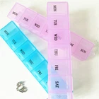100% Brand New And High Quality Pill box with 7 compartments Lightweight so easy to store & easy to open lids! Great quality plastic pill box allows the pills or tabs to be easily visible. Material: Plastic Color:Blue,Pink,White Size: 15*3*2cm Packing Included: 1 PC 7 Days Weekly Pill box Note: Please be aware that due to your computer monitor display the color may have some difference between the picture and the real item. There is 2-3% difference according to manual measurement.