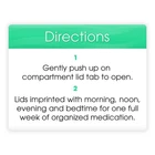 Keep your important medications organized with this convenient Equate 4-A-Day Weekly Pill Planner. With easy-to-open lids, this pill container has 28 brightly colored compartments. The lids are imprinted with "morning," "noon," "evening," and "bedtime" for one full week of organized medication. Keep it on your bathroom counter so you'll never miss a dose of your medicine. Equate 4-A-Day Weekly Pill Planner helps you stay on top of your important medications. Making the right health decisions can be challenging. With a complete range of products and simple solutions, Equate allows you to take care of your family with confidence. Equate 4-A-Day Weekly Pill Planner: Keep your important medications organized 28 brightly colored compartments Provides 1 full week of organized medication Eye-catching colors ensure you remember to take your medicine Ideal size for your vanity or bathroom counter This product is not child resistant