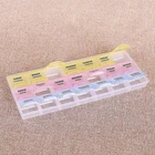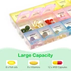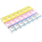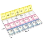 Name:7 Day Pill Organizer 3 Times A Day Material: plastic Product Size:8.46 x 4.72 x 0.9 inch Weight:3.88 OZ Small Compartments Size:1.37 x 1.18 inch x 0.78 inch Package Include: 1 Pill Box 【Safe and Healthy】 The weekly pill organizer is healthy and safe for medical use. 【SIZE】: Overall Pill Box Size: 8.46x4.72x0.9 inch, Single Pill Organizer size: 1.18x1.37x0.78 inch. 【SPECIFICATION】: 7 Day Pill Box 3 Times a Day. The lids of this pill box are translucent,you can see the pills in it. 【Easy to Open and Close】 This pill organizer,the snap-shut lids always stay closed tightly, would never pop up even when dropped. 【3 Times a Day Medication Planner】 This pill box 7 day have 21 compartments with 3 different colors and week day labels, makes you know clearly that you have taken the medicine or not today.