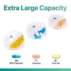 Pill Dispenser 7-DAY PILL ORGANIZER: AM/PM split pill compartments make planning daily doses easy. Colored transparent lids and morning/night and day icons help you quickly identify your vitamins, supplements, and medication. Fill once per week and done! OVER 10 YEARS OF USE: Our weekly pill organizer's silkscreen printed icons never rub off even with soap washes/daily use. Odorless plastic built for 20,000 open-closes and prevents pill residue, making cleaning easy and guaranteeing safe pill storage. LARGE STORAGE & PORTABLE DESIGN: Pocket-sized with individual carry cases that fit on your person while on the road. Each pill case compartment can hold 8 Fish Oils, 7 Vitamins, or 14 Capsules. Compartment size: 5.94" x 2.83" x 2.62". ARTHRITIS FRIENDLY: Indented flap makes opening effortless for those with less strength in their hands/wrists. A secure lid prevents dust or moisture from getting, and keeps the pill box tightly closed when dropped and prevents spills. The rounded shape makes retrieving pills easy. NOT ONLY PILL BOX: Can be used as a storage case for jewelry, earring, necklace and any small items.