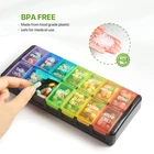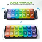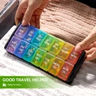 Easy and Quick Filling: This daily pill organizer is easy to open, and allows you to load your weekly medication faster, without the need to open 14 compartments. Large Capacity: This pill holder's large compartments can hold at least 12 fish oils or 11 large vitamins. Product size: 8.4 x3.7 x1.2 inches (each compartment measures 1.1 x 1.6 x 0.7 inches). No Need to Remember: The days of the week are marked on the organizer, so you know what to take each day. The upgraded printing can withstand up to 20,000 uses without wear and tear. Health-friendly: Made of good quality material, this transparent dispenser organizer is safe for health care. It is marked with AM/PM to help you distinguish your medications. NOT ONLY PILL BOX: Can be used as a storage case for jewelry, earring, necklace and any small items.