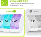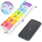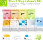 Weekly Pill Organizer Arthritis Friendly, BPA Free Travel 7 Day Pill Box Case with Spring Open Design and Large Compartment to Hold Vitamins, Cod Liver Oil, Supplements and Medication Spring-assisted Open Design: This weekly pill organizer can achieve one-handed operation with the little rubber strips for the smart "lid spring open" feature. The lids are vividly colored and marked clearly with the date, all is clear at a glance and you can access the pills you need easily. It's ideal for daily pills dispensing and big enough to hold 8 fish oils or 11 large vitamins for each dose (Overall size: 8.83" x 2.1" x 1.03", size of each compartment: 1.3" x 1.18" x 0.82") Say Goodbye to Dumpage Pills: No worries about unwanted pill dumpage found by pets and kids for your slightest unintentional or incidental touch on the medicine organizer. The push button stays closed once locked and securely snaps shut keeping pills safe. It's small and perfectly suitable for travel and is ideal for storing small jewelry or items such as earrings, beads, nail art tips Premium Screen Printing: To avoid screen-printing fonts and icons falling off from the surface of the pill box, we use high-end screen printing ink and strictly do the Ink Adhesion Test with 3M Tapes before shipment. Thus, no need to be frustrated with the missing fonts of "Tuesday" or icons of "PM", and worry about mistakenly taking the wrong tablets BPA-Free Material: This pill case is safe to store pills because it is made of food-grade materials. Worry-free with the BPA-free pill boxes and organizer when storing multiple pill regimes inside. With the transparent plastic lid, it's quite easy to distinguish the pills in each dose without opening the lids