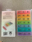 Two 7 day, 3 times a day pill boxes. One new, one in good used condition. See pics please. Each day can be removed to carry with you. Thanks for looking.