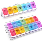 Weekly Pill Organizer(Twice a day) A new generation of multifunctional medicine holder,more convenient to use. Meet your all needs √ Rainbow color compartment √ Clear appearance Design √ Easy to open √ High Capacity √ Meet the needs of one week √ Removable Design Safe and Food-Grade Material PP It is plastic that can be directly contacted with food. It has been certified by SGS and can be used safely. UV Printing increase product brightness and not easy to scratch. Product weight: 206 Grams Product Size: 8.9 x 4.84 x 1.34 inches One compartment size: 1.22 x 1.14 x 1.14 inches One compartment can be contained: 13 pills or 9 fish oils or 11 capsules