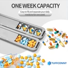 Reliable Material: 7 Day Pill Organizer is made from food-grade materials, ensuring durability and cleanliness for storing your medication. Ideal for keeping your pills clean and organized. Unique Design: Travel pill box features a magnetic closure design, making it easy to open and close. The sliding mechanism ensures that the pills stay securely in place, providing double protection. Our medicine organizer especially suitable for individuals with arthritis, limited flexibility, or the elderly. Our pill container is designed to hold a week's supply of morning and afternoon medication, with clear and legible printing to eliminate concerns about missing doses. Large Capacity: Daily pill box organizer features 14 compartments, each measuring 1.42*1.22*0.43inches, making it easy to accommodate small to medium-sized pills and supplements. With the sliding cover and magnetic closure, our medicine box keeps your medication clean. Easy to use and carry: Simply apply gentle force to open the daily pill organizer, slide the cover, and retrieve the pills,when it’s time to take your pills. Our medication organizer is foldable, making it ideal for short trips and business travel. Small pill case could be conveniently stored in backpacks, handbags, or suitcases. Perfect Gift & Warranty: Our cute pill organizer features a brand-new design that makes it an ideal gift for family or friends. Moreover, you can unleash your creativity and personalize the appearance of our pill holder by decorating it with stickers, creating a unique and cool design.5.We provide great after-sale service. If you are not satisfied with our 7 day pill box, Please feel free to contact us, we will provide you with suitable solution ASAP!
