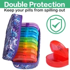 WEEKLY PILL ORGANIZER: travel pill organizer set includes a PU leather pill case and 7 day pill boxes, 2 times a day with separate AM and PM compartment. Each pill box is printed with day of the week and AM/PM icon so you can plan and load your pills for an entire week in advance. The daily pill box has large capacity to hold your medicine, vitamins or supplements. Each compartment can hold approximately 6 fish oils or 14 capsules. PREMIUM QUALITY AND SAFE MATERIAL: The pill case is made of lightweight, waterproof and durable PU leather with premium zipper to ensure smooth opening and closing of the pill bag. The AM PM pill organizer 7 day is made of solid food grade BPA FREE material, it's safe and healthy for medical use. Besides, the pill container adopts high-end silk screen printing technology to ensure that the labels will never rub off easily. DUAL PROTECTION: medicine organizer provides double protection to your pills. The daily pill box is designed with snap fit feature, once snap on, it won't pops open. The PU leather pill case with inner cushion layer and sturdy zipper adds protection to the pill boxes, keep your pills from spilling out. The PU leather is also waterproof and moisture proof to further enhance safe storage of your medicine. COMPACT AND PORTABLE: The travel pill organizer is lightweight with dimension approximately 6.0 x 3.5 x 2.1 in. It is convenient to carry into your luggage, backpack, suitcase or handbag. Alternately, you can take an individual daily AM/PM pill box (dimension: 2.8 x 1.7 x 0.7 in) that you need for the day and drop it in your purse or pocket.It's convenient to bring around and can be used at different places like office or during travel. UNIQUE STYLISH DESIGN: medication organizer case is designed with multiple unique and stylish patterns, as well as multiple colors for your choices. For people who likes simple, we also have pill case with just plain color. Please take note that some patterns come with 7 black color pill boxes while some come with 7 rainbow color pill boxes as shown on the respective product pictures. The beautiful zipper bag protects your medication privacy in public.