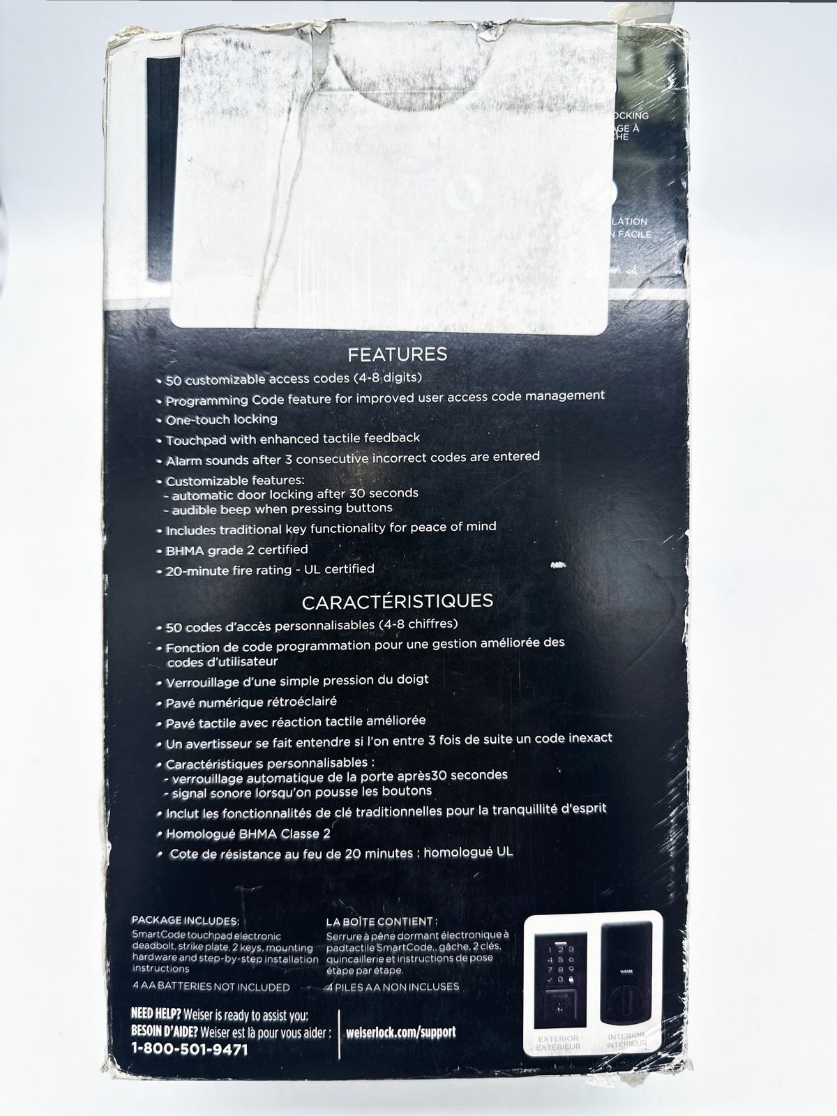 Weiser SmartCode 10 Matte Black Keyless Entry Deadbolt Lock - Preowned - Good Weiser SmartCode 10 Matte Black Keyless Entry Deadbolt Lock - Preowned - Good Weiser SmartCode 10 Matte Black Keyless Entry Deadbolt Lock - Preowned - Good The Weiser SmartCode 10 is a sleek and modern keyless entry deadbolt lock designed to enhance both security and convenience for your home. Finished in a sophisticated matte black, this electronic lock features a 10-button backlit keypad, allowing for easy code entry even in low-light conditions. With the capacity to program up to 50 unique user codes, it's perfect for accommodating family members, guests, or service personnel. The SmartCode 10 also boasts Weiser's SmartKey® Security technology, enabling you to re-key the lock quickly and easily if necessary. Specifications: Finish: Matte Black Keypad: 10-button backlit touchpad User Codes: Up to 50 programmable codes Lock Type: Motorized deadbolt Power Source: 4 AA batteries (not included) Dimensions: 7 x 2.5 x 13.2 cm Material: Metal Features: Keyless Entry: Eliminates the need for traditional keys; enter your home with a personalized code. Backlit Keypad: Ensures visibility in low-light environments, enhancing ease of use. Multiple User Codes: Program up to 50 unique codes, ideal for family members, guests, or service providers. SmartKey® Security: Allows you to re-key the lock quickly, providing enhanced security and flexibility. Easy Installation: Fits standard doors (1-3/8" to 2" thickness) and installs with just a screwdriver; no hardwiring required. Auto-Lock Feature: Option to set the lock to automatically re-lock after a predetermined time for added security. The Weiser SmartCode 10 combines modern aesthetics with advanced security features, making it a valuable addition to any home's entryway. Its user-friendly design and customizable access options provide both peace of mind and convenience for today's homeowners. Listing and template services provided by inkFrog