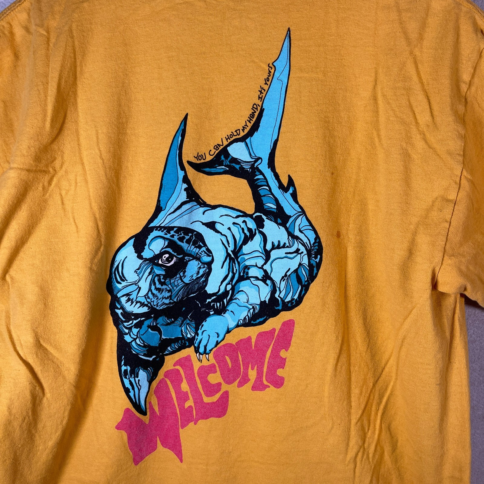 Welcome Skateboards Shark Graphic T Shirt Mens Large Yellow Streetwear Tee Bold mustard yellow tee by Welcome Skateboards featuring front occult-inspired triple eye logo and a striking back graphic of a twisted shark with retro comic-style “Welcome” text. Men's size Large. This standout piece is made of 100% cotton and perfect for fans of underground skate fashion and bold artistic statements. skatecore, streetwear, grunge, graphic tee, punk, alternative fashion, Welcome Skate Co, Y2K, retro surf, indie street style, altwear, shark print, tattoo art tee, soft grunge, dystopiacore, counterculture, underground fashion, goth surf N23