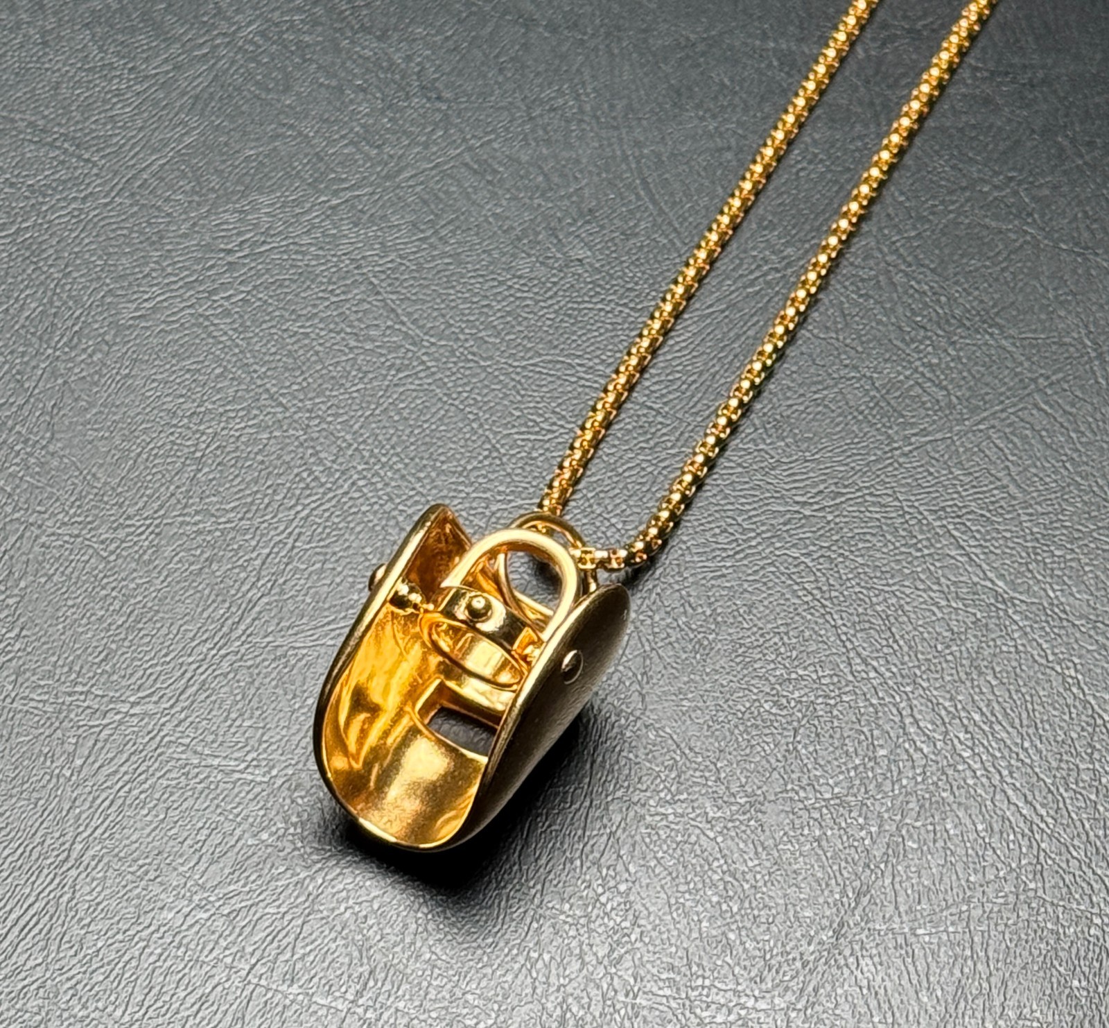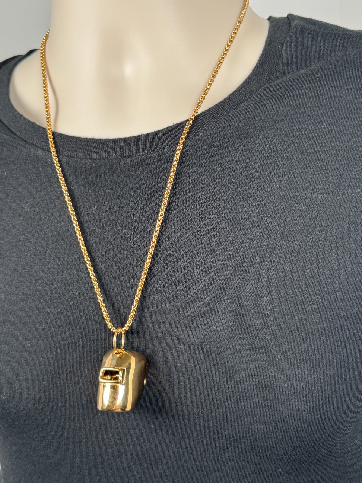 Welder Helmet Pendant with Titanium Steel Chain in a Gold Plated Finish Make a bold statement with this Gold plated titanium steel welder helmet pendant, paired with a sleek titanium 23.5" box style chain for lasting durability and modern style. Measuring 1.38” x 1.14” (3.5cm x 2.9cm), this finely crafted pendant brings the spirit of the workshop into everyday fashion. Why You’ll Love It: • Eye-Catching Design – Inspired by real welding gear, the miniature helmet is a head-turning symbol of skill, grit, and individuality. • Built to Last – Made from premium titanium steel with a gold plated finish, it’s wear-resistant, tarnish proof, and crafted to stand up to daily wear without fading or bending. • Versatile Style – Designed for both men and women, this necklace adds a bold, industrial edge to any outfit - perfect for parties, casual hangouts, or weekend adventures. • Meaningful Gift – The perfect gift for welders, makers, or anyone who appreciates craftsmanship. Ideal for birthdays, holidays, graduations, or anniversaries. Packaged in a stylish black jewelry card, ready for gifting!