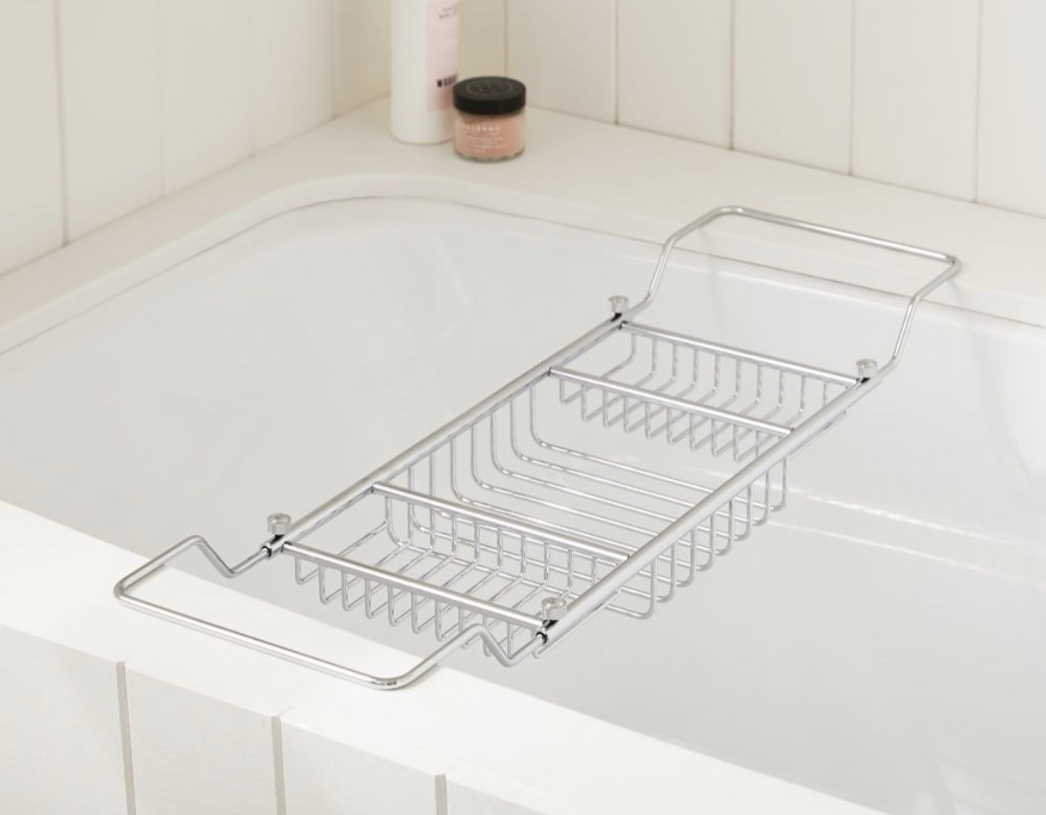 The West Elm Brushed Nickel Eldred Bathtub Caddy is a stylish and functional addition to your bathroom. Crafted from solid brass, this rectangular caddy features a brushed nickel finish that complements any decor. With an adjustable length that extends up to 38 inches, this ergonomic design is easy to remove and rust-resistant. Perfect for adding a touch of luxury to your bath spa, this classic piece from West Elm is a must-have for any bathroom. Made in India, this bathtub caddy/tray is both durable and elegant, making it a practical and attractive choice for your home.