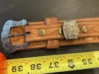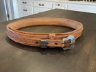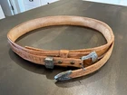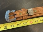 Add a touch of Western Americana to your outfit with this genuine leather belt buckle trim featuring sterling silver accents. The buckle is perfect for belts in sizes 32-36 and is ideal for collectors of Western Americana culture and ethnicity items. The provenance of the buckle is not available, adding to its mystery and allure. It is a unique addition to any collection and is perfect for daily wear or special occasions.