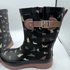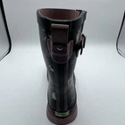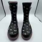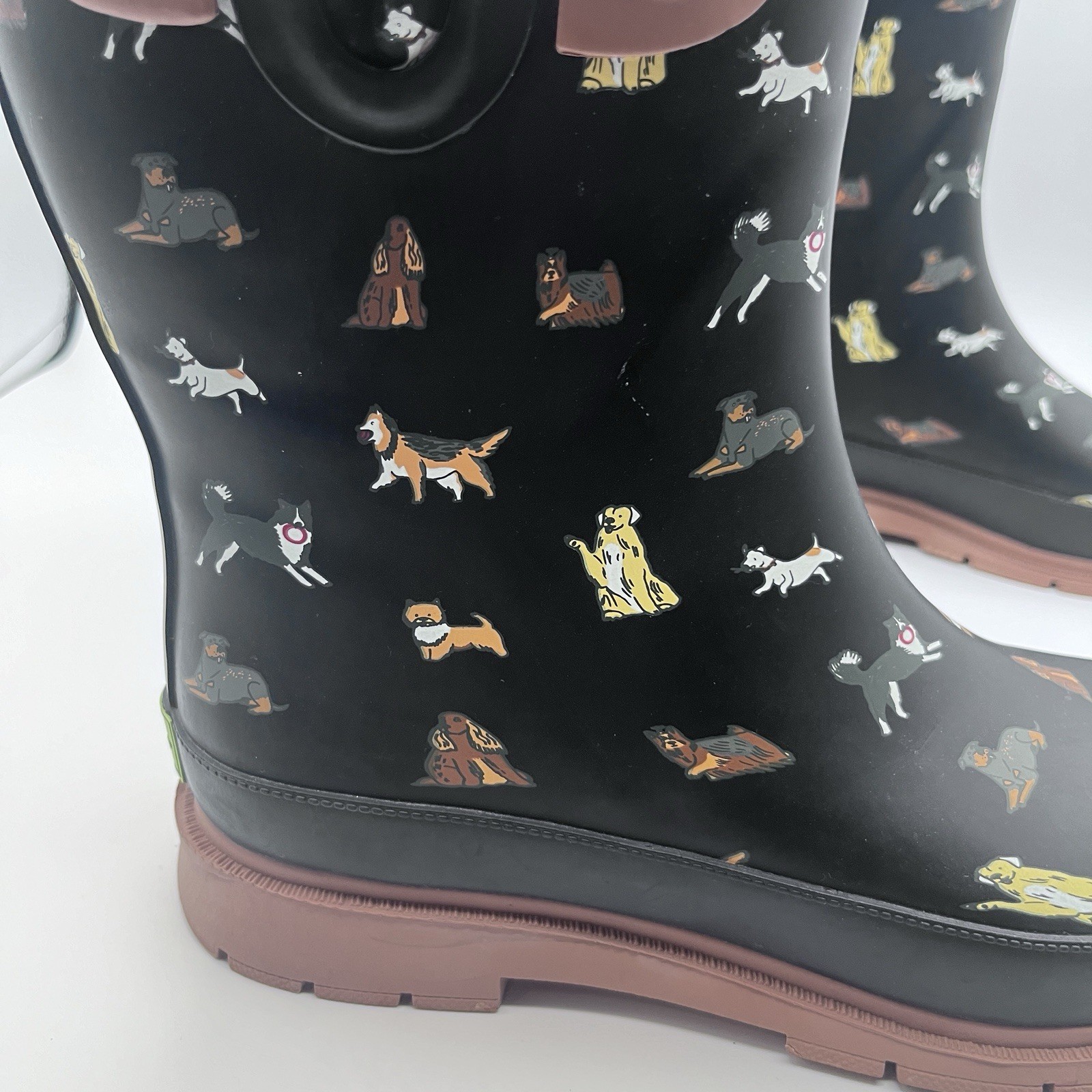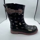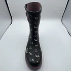 The Western Chief Women's Dog Themed Rain Boots in size 8 feature a fun and stylish design with a black animal print pattern showcasing cute dog motifs. These mid-calf boots have a round toe shape and a pull-on closure for easy wear. Made of waterproof rubber, these boots are perfect for all seasons and are designed to keep your feet dry and stylish in rainy weather. The Western Chief brand ensures quality and durability, making these boots a must-have for any dog lover or fashion-forward individual looking for a unique and practical footwear option. * These Western Chief Women's Horse Themed Rain Boots Size 8 are in good-great condition. Please take a look at all photos.